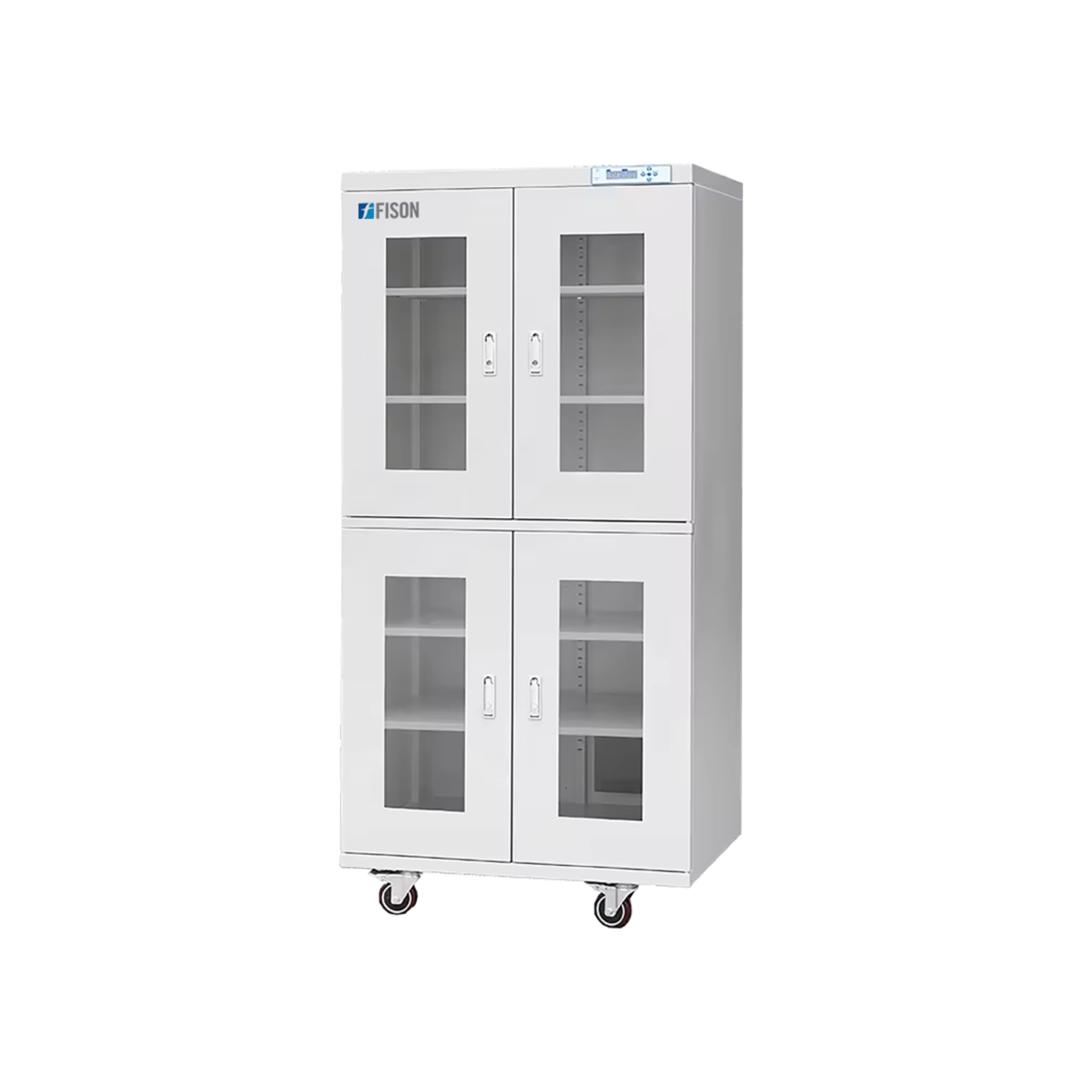 Fison Glassware Drying Cabinet is made of rust-resistant steel with an antistatic paint finish. It offers an 870-liter capacity, providing plenty of space for various items. The glass doors enable easy monitoring of the drying process, while the adjustable humidity control ensures ideal drying conditions.