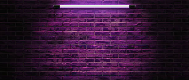 Glowing purple, blue, neon lamps on a background of a brick wall indoors 3D Rendering