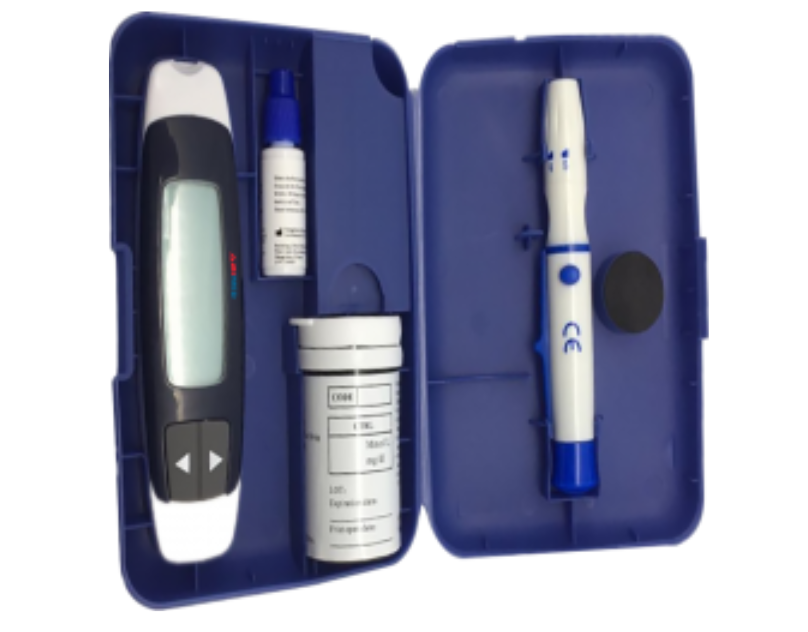 Abimed Blood Glucose Meter measures glucose levels from 40 to 600 mg/dL using a 1 µL sample and provides results in just 5 seconds. It features a 360-reading memory, averages for 7, 14, and 28 days, auto power-off, an alarm, dual scale, and optional coding for convenience.