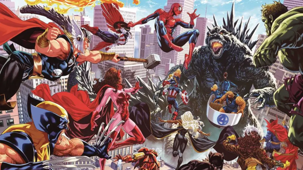 Godzilla Destroys the Marvel Universe 1 wraparound cover cropped by Mark Brooks