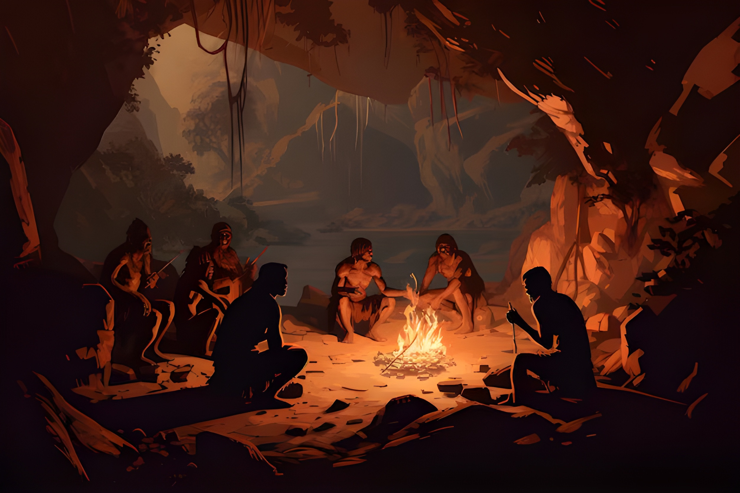 group people sit around campfire delighting comforting warmth companionship prehistoric cave dweller