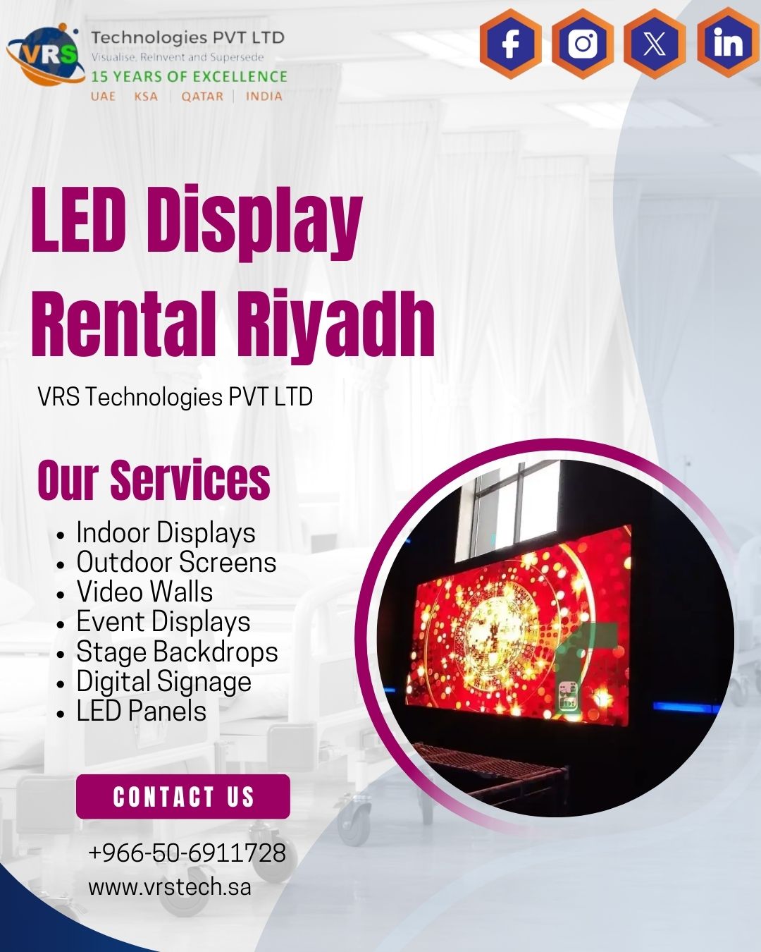 High Quality LED Wall Rental Services in Riyadh by VRS Technologies deliver vibrant visuals, seamless setup, and reliable performance for events, exhibitions, and promotions. Choose expert LED Display Rental Riyadh solutions. Call +966-50-6911728 for bookings.