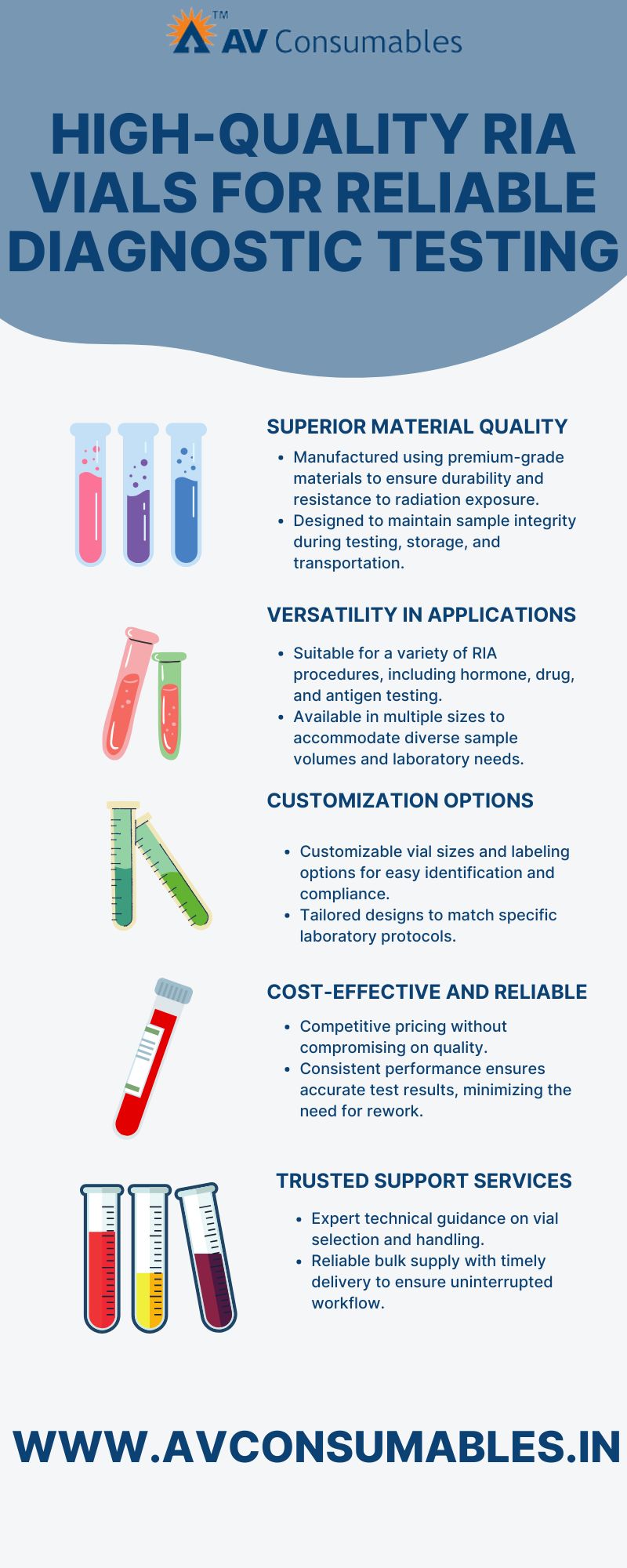 Explore the role of RIA Vials in advancing Radioimmunoassay (RIA) testing. Designed for precision and durability, these vials from AV Consumable are perfect for achieving accurate results in laboratories and research settings. Enhance your testing efficiency with trusted lab consumables. Learn more at AV Consumable.