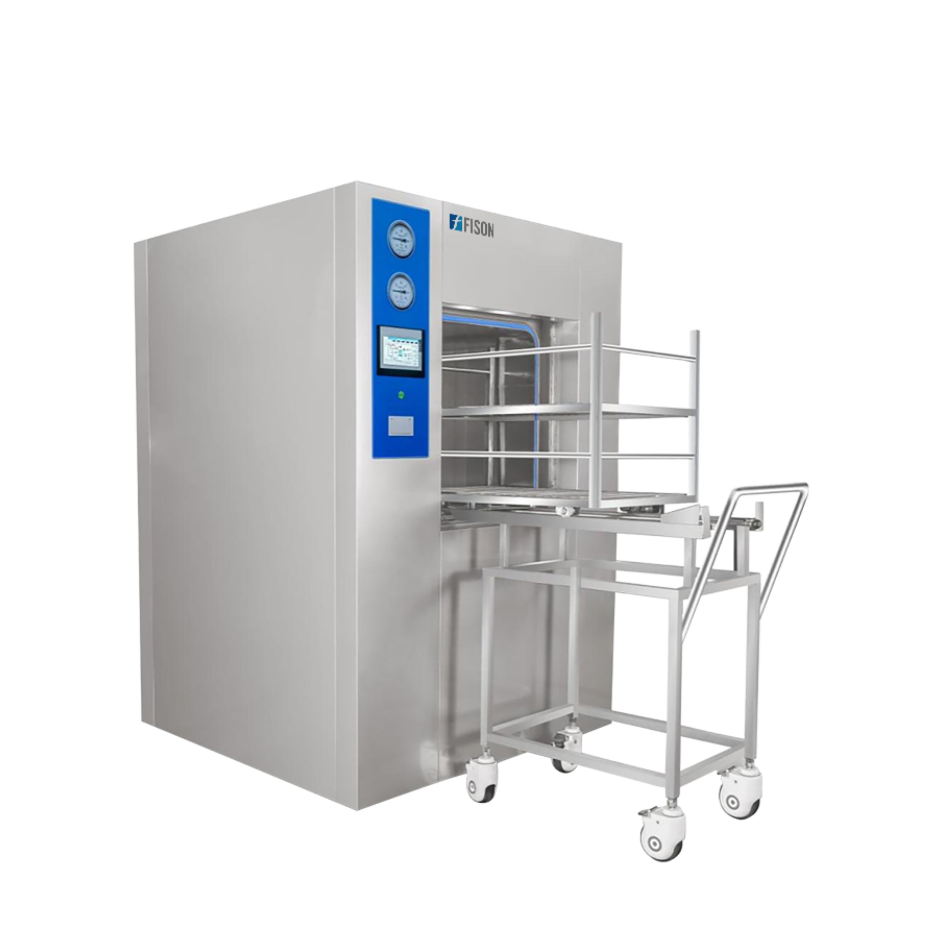 Fison Horizontal Autoclave features a 500L capacity with S30408 stainless steel interior liner and door panels. Its double pulsation method ensures thorough air removal during sterilization. The system includes a 7-inch color touch screen, four-level password access, removable drain filter plugs and an insulated steam generator for enhanced performance.