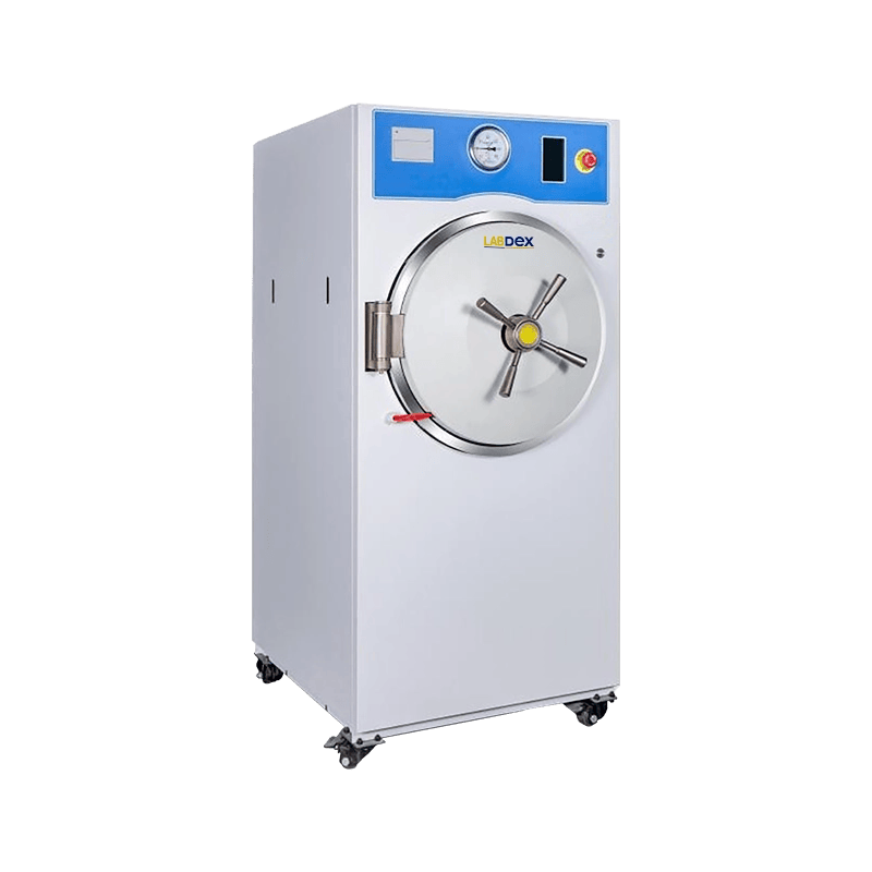 labdex Horizontal Autoclave is a horizontal steam sterilizer with round SS304 chamber, separate high efficiency steam generator and color touch screen control. It features pulse vacuum drying reducing residual moisture below 0.2%, automatic safety interlocks, real time fault alerts, and microprocessor cycles.