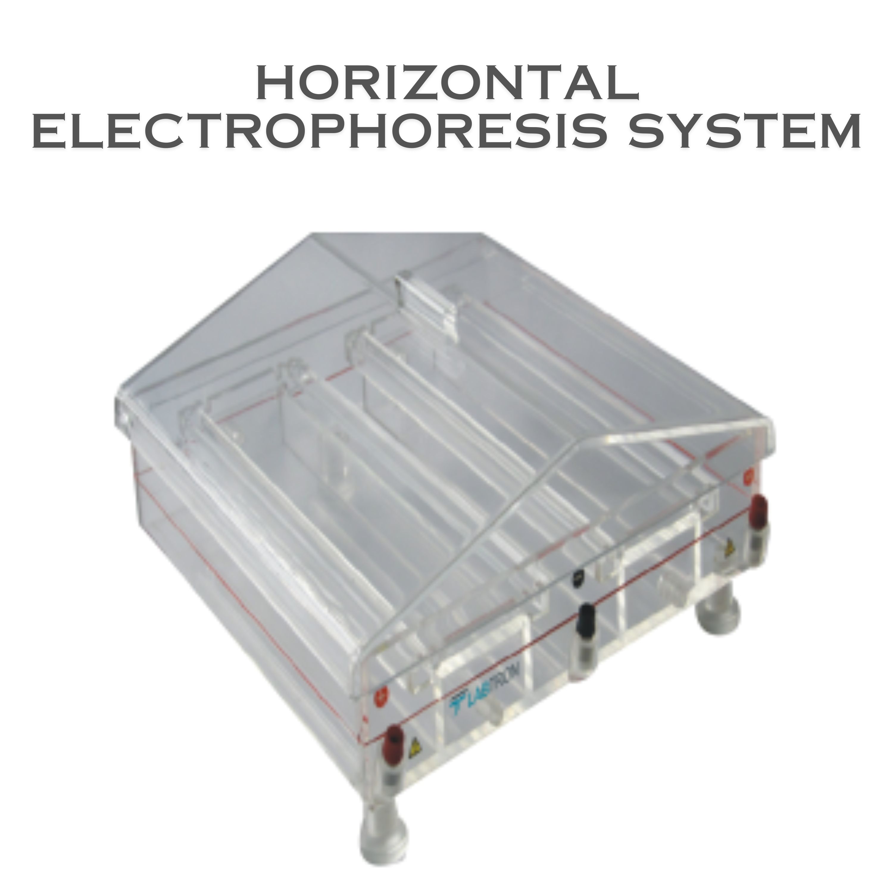 Labtron Horizontal Electrophoresis System (DUAL TANK) features three platinum electrodes (1 negative, 2 positive), a tank, swim clubs, latex tube, and power cord (296×266×122 mm). It saves samples, offers high specificity and strong resolution, stores 12 procedures, and includes optional temperature control.