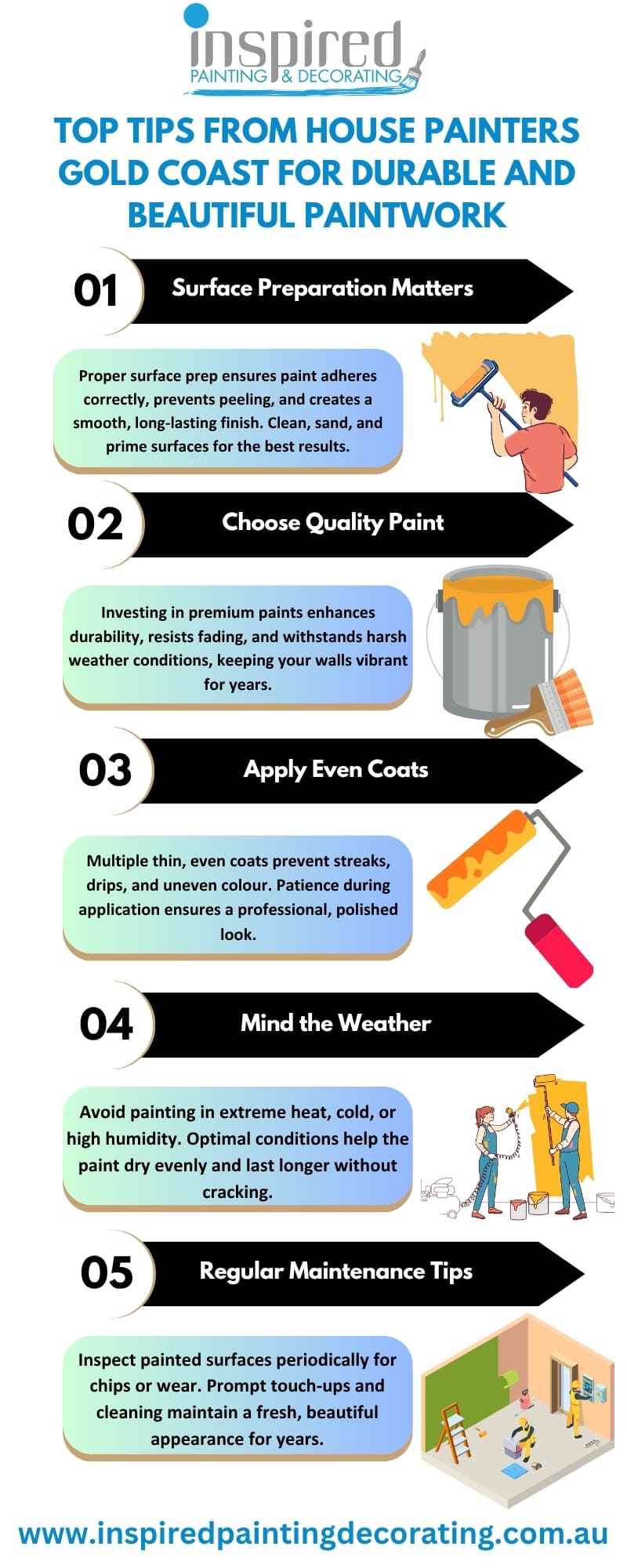 Do you want to add a new, polished gloss to your house? To realise your vision, Inspired Painting & Decorating provides professional services. Our talented group of Gold Coast house painters specialises in both exterior and interior painting, producing excellent outcomes that raise the appeal of your property. To guarantee long-lasting, faultless finishes that suit your style, we employ high-quality materials and methods. Our first goal is client pleasure, and we take pride in our dependable service and meticulous attention to detail. Give Inspired Painting & Decorating a call at 61422081809 for outstanding painting services, and let us to transform your house. Visit Now, https://inspiredpaintingdecorating.com.au/