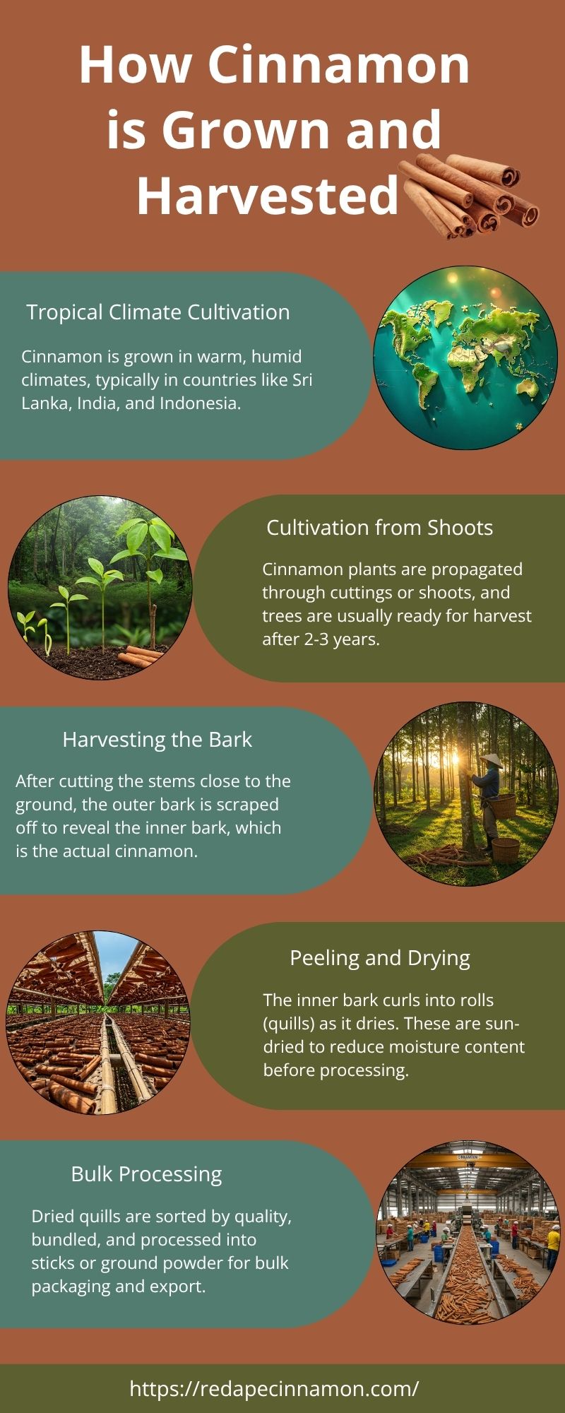 Discover the journey of our wholesale cinnamon sticks, carefully cultivated in tropical regions, harvested by skilled farmers, and processed to preserve their rich aroma and flavor. Ideal for bulk buyers, retailers, and food industries, our cinnamon sticks are sorted, graded, and packed to meet global quality standards. Buy now at https://redapecinnamon.com/wholesale-orders/