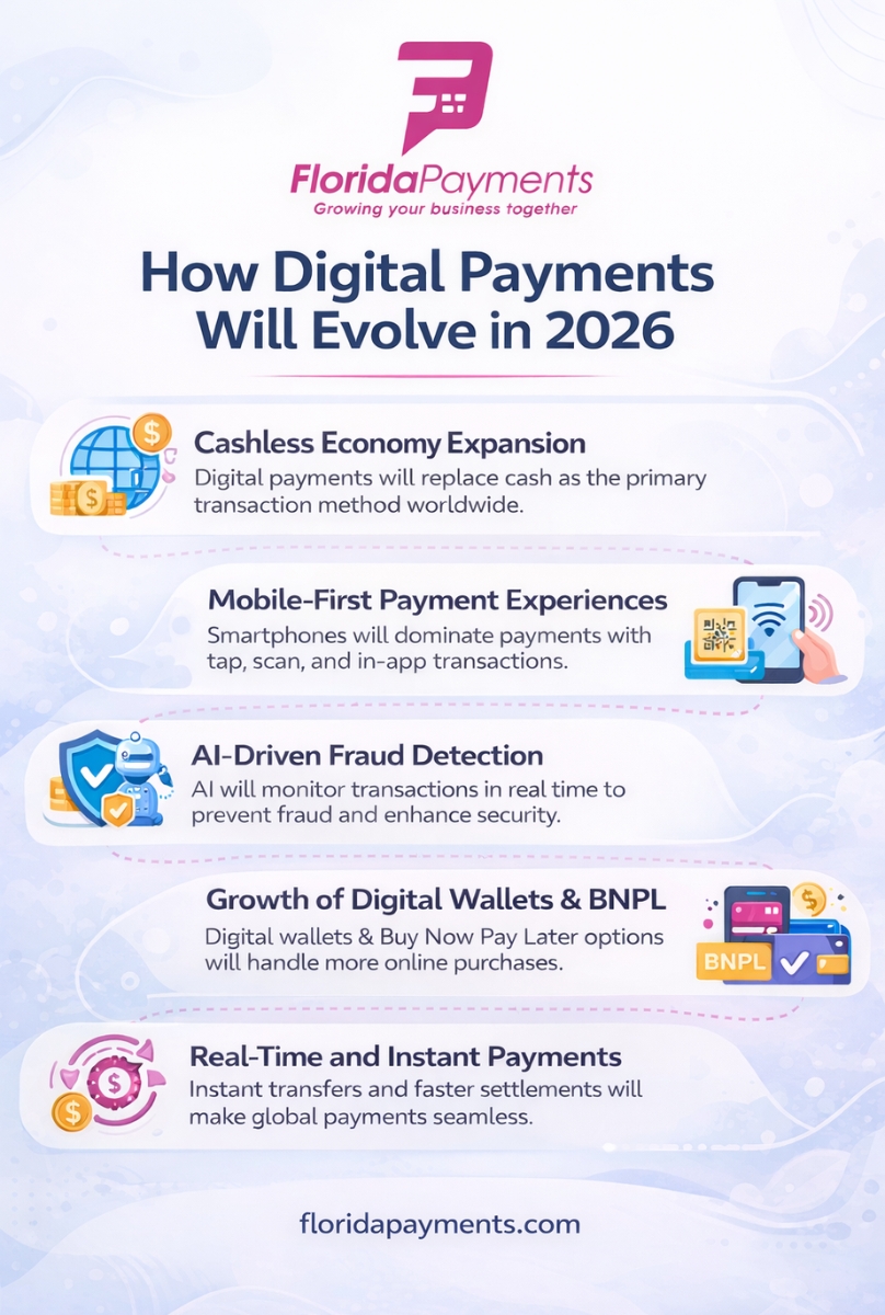 This infographic explains how digital payments are expected to grow and change in 2026. It highlights key trends such as the rise of cashless transactions, mobile-first payment options, and the increasing use of digital wallets and Buy Now Pay Later services. It also shows how AI is helping improve fraud detection and how real-time payment systems are making transactions faster. Overall, digital payments are becoming more secure, simple, and convenient for both businesses and customers in everyday transactions. Learn More: https://floridapayments.com/how-digital-payments-will-evolve-in-2026/