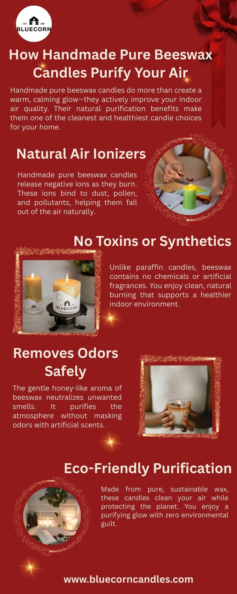 The natural ions neutralize dust and toxins, thus your living space becomes cleaner and fresher. The process by which handmade pure beeswax candles purify the air in your home is a disclosure of the inherent advantages of using clean, environmentally friendly candles. Visit us: https://bluecorncandles.com/