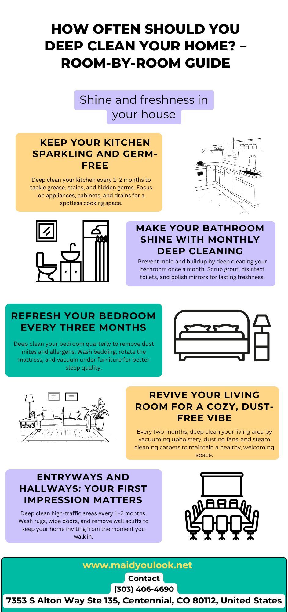 Learn how often to deep clean every room in your Aurora home. Keep your kitchen, bathroom, and living spaces fresh, healthy, and perfectly maintained. Know more https://maidyoulook.net/aurora/