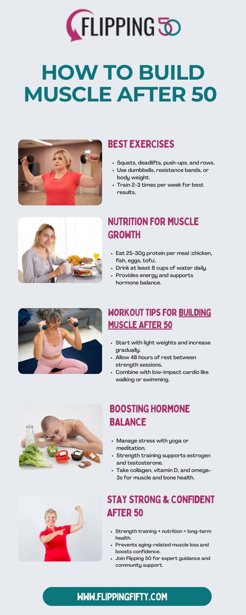 After 50, maintaining muscle strength becomes crucial for overall health, mobility, and independence. Therefore, building muscle after 50 for women is not just about looking fit—it’s about feeling strong, confident, and healthy. By focusing on weight training, proper nutrition, and recovery, you can stay active and independent for years to come. Whether you're new to fitness or looking to improve your routine, strength training can help you stay active and energized. This infographic will show you how to build muscle effectively and safely after 50. Start your journey today with Flipping Fifty, expert-approved fitness strategies.