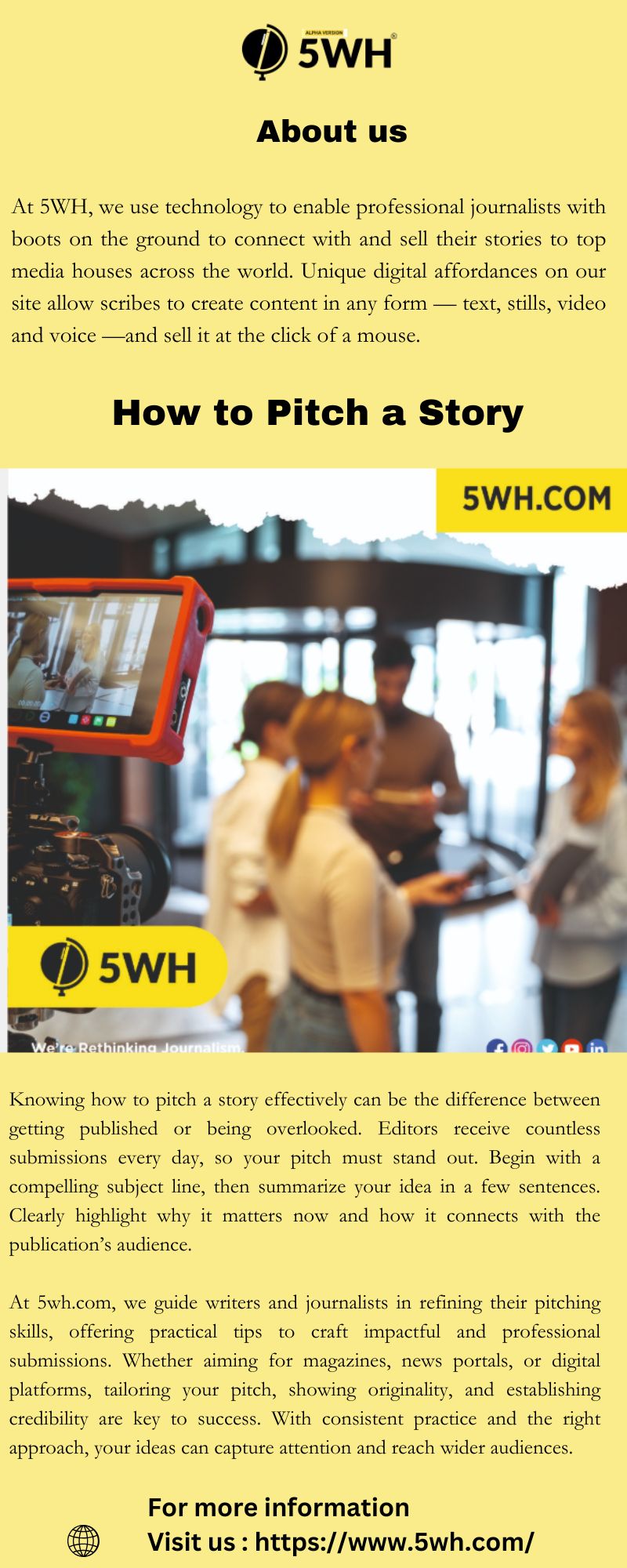 At 5wh.com, we help writers and journalists refine their skills by offering practical guidance on crafting impactful pitches. Whether you’re submitting to magazines, news portals, or digital platforms, knowing how to pitch a story professionally increases your chances of success. Always tailor your pitch to the publication, show originality, and demonstrate credibility. With practice and the right approach, your ideas can reach wider audiences.