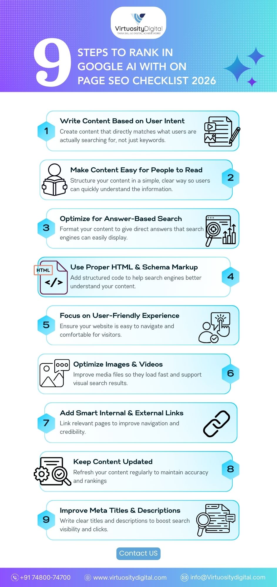 Learn how to improve your website rankings with this easy-to-follow on-page SEO infographic for 2026. It shares 9 practical steps including user-focused content, clean structure with HTML and schema markup, better user experience, optimized images and videos, smart internal and external linking, updated content, and improved meta titles and descriptions. A perfect visual guide for anyone looking to boost search visibility.