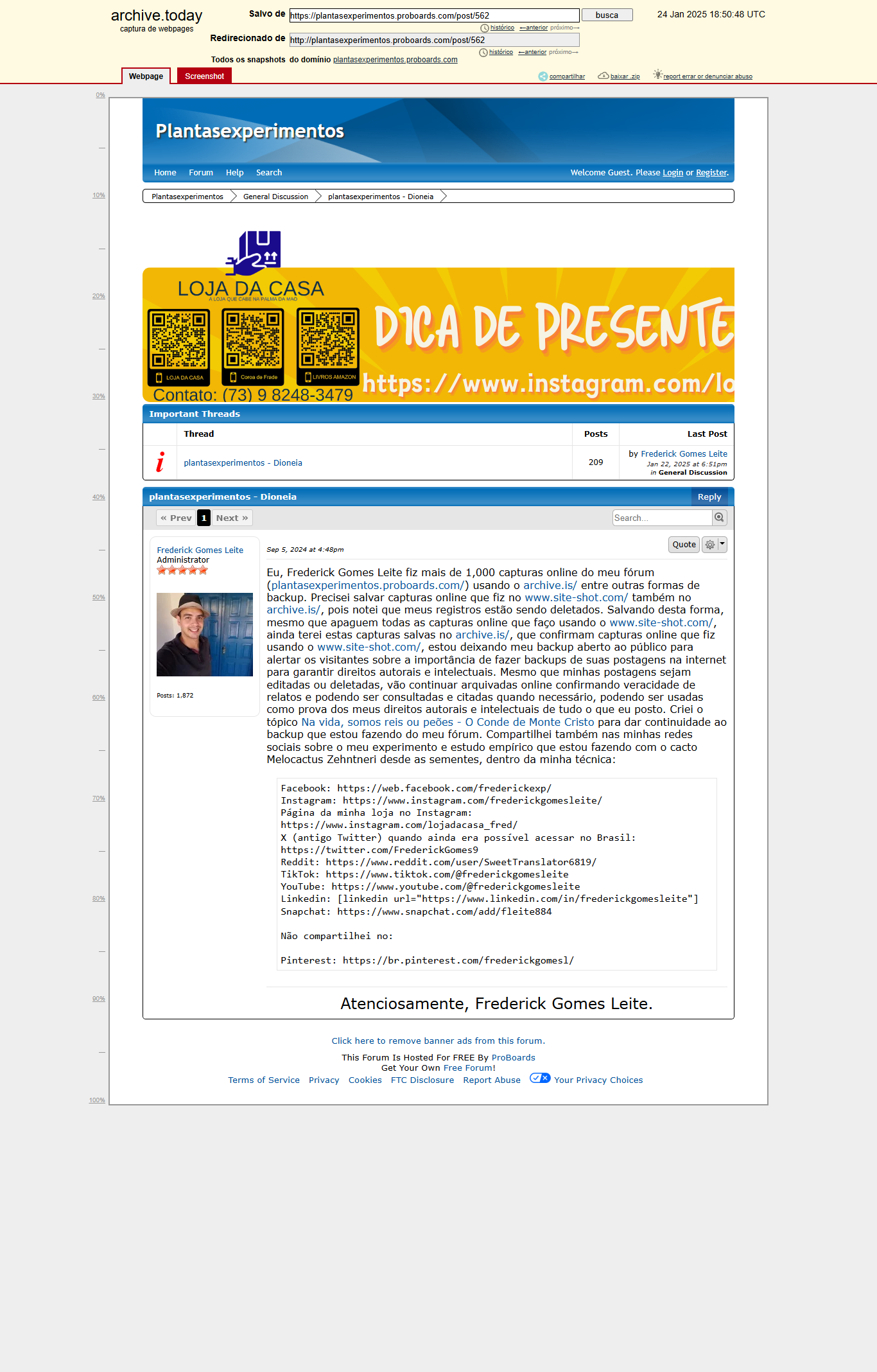 Eu, Frederick Gomes Leite, natural de Eunápolis/Bahia, filho de José do Egito Ferreira Leite com Janilde Gomes Cardoso, com avós paternos Edvaldo Ferreira Leite e Edith Ferreira Leite e avós maternos Jair Gomes Cardoso e Laudelina Carmonia Cardoso, moro no mesmo endereço desde 2004: Rua M, Casa 15, Urbis 2, CEP: 45829086, Eunápolis/BA, e sempre informei meu endereço e dados corretos em todos os cadastros que faço na internet. Em 2019 comprei sementes da planta carnívora Dioneia e usei pela primeira vez a minha técnica - usar plástico específico para estufas que difunde bastante luz como cobertura para vaso, para acelerar a germinação e o crescimento e manter plantas de sol pleno saudáveis sob as condições de poucas horas de luz solar indireta pela manhã - compensando a falta de sol pleno com muita luminosidade natural - no experimento que eu idealizei e executei dentro da minha técnica. Compartilhei em fórum brasileiro que fazia parte como membro comum desde o início, também em minhas redes sociais e vários lugares na internet, encaminhando para o meu tópico em fórum brasileiro. Em 2020 criei o meu fórum grátis, https://plantasexperimentos.proboards.com/thread/3/plantasexperimentos-dioneia, e fiz transcrição de todo material que postei em meu tópico no fórum brasileiro, dando continuidade ao compartilhamento da execução das minhas ideias também com outras plantas de sol pleno desde as sementes. Nos tópicos: A morte é um cobrador muito sério (upload de imagens de capturas online com o Imgur), Porque és pó e ao pó tornarás (capturas online com o Archive.ph), Não te deixes vencer pelo mal, triunfa o mal com o bem (capturas online de capturas online com o Postimages), Você consegue ? (capturas online de capturas online com o ImgBB), Para mim a mente é sempre a melhor arma (upload de imagens de capturas online com o Imghippo), Nunca é tarde demais (capturas online de capturas online com o Freeimage.host), Mas agora isso vai mudar (upload de imagens de capturas online com o YourImageShare), O Titanic vai afundar (upload de imagens de capturas online com o imglink.io), Entendo completamente a gravidade da minha situação (upload de imagens de capturas online com o 8upload) e O reino de Deus está dentro de você (upload de imagens de capturas online com o imgbox), são 10 tópicos de backup carregando todas as postagens do meu fórum em servidores diferentes, com exceção das postagens dos próprios tópicos de backup recentes, que não se repetem em tópicos de backup e confirmam os 11 tópicos de backup que criei em 2024. Tenho duas contas no Imgur (https://imgur.com/user/FrederickGomesLeite/about, https://imgur.com/user/estouaquiagorasim1993/about), que uso para fazer upload dos meus registros fotográficos e capturas de tela com o GoFullPage (https://gofullpage.com/) de todas as minhas postagens no meu fórum e na internet, e conteúdo de capturas online com archive.is/ (.fo .il .md .ph .vn), entre outras formas de backup. No tópico de backup Mesmo inimigos podem se respeitar (https://plantasexperimentos.proboards.com/thread/75/mesmo-inimigos-podem-se-respeitar) estou compartilhando todas as capturas online que faço com o archive.is/ (.fo .il .md .ph .vn) carregando direto de servidores do archive.is/ (.fo .il .md .ph .vn) no meu fórum. Criei o tópico de backup recente, Conte a eles nossa história (https://plantasexperimentos.proboards.com/thread/76/conte-eles-nossa-hist-ria) para salvar o conteúdo (imagens, vídeos e textos) das postagens do meu tópico plantasexperimentos - Dioneia (https://plantasexperimentos.proboards.com/thread/3/plantasexperimentos-dioneia) em vários servidores na internet e carregar novamente no meu fórum. Também estou fazendo backup do source code (código fonte) do meu fórum e capturas online com o archive.is/ (.fo .il .md .ph .vn), em formato de texto que também pode ser compilado online (carregado), exibindo a postagem com a captura online da postagem e o conteúdo (imagens, textos e vídeos) no navegador em formato visual, confirmando a veracidade dos meus relatos, a existência das minhas postagens e capturas online com o archive.is/ (.fo .il .md .ph .vn), entre outras formas de backup, pois um homem prevenido vale por dois.