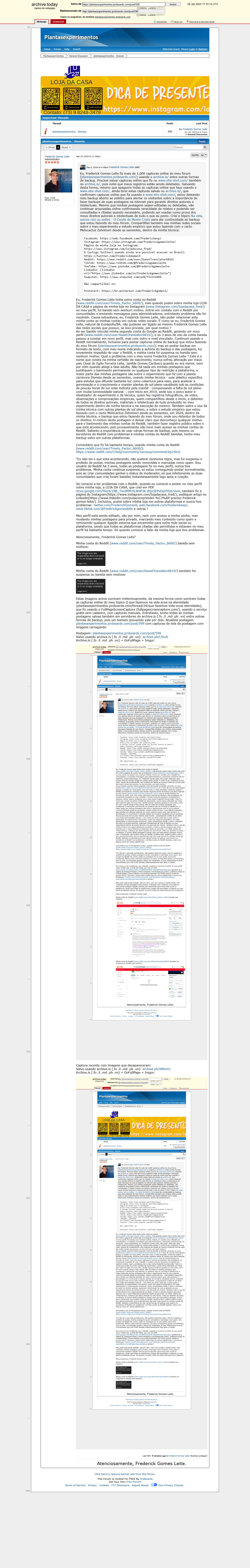 Eu, Frederick Gomes Leite, natural de Eunápolis/Bahia, filho de José do Egito Ferreira Leite com Janilde Gomes Cardoso, com avós paternos Edvaldo Ferreira Leite e Edith Ferreira Leite e avós maternos Jair Gomes Cardoso e Laudelina Carmonia Cardoso, moro no mesmo endereço desde 2004: Rua M, Casa 15, Urbis 2, CEP: 45829086, Eunápolis/BA, e sempre informei meu endereço e dados corretos em todos os cadastros que faço na internet. Em 2019 comprei sementes da planta carnívora Dioneia e usei pela primeira vez a minha técnica - usar plástico específico para estufas que difunde bastante luz como cobertura para vaso, para acelerar a germinação e o crescimento e manter plantas de sol pleno saudáveis sob as condições de poucas horas de luz solar indireta pela manhã - compensando a falta de sol pleno com muita luminosidade natural - no experimento que eu idealizei e executei dentro da minha técnica. Compartilhei em fórum brasileiro que fazia parte como membro comum desde o início, também em minhas redes sociais e vários lugares na internet, encaminhando para o meu tópico em fórum brasileiro. Em 2020 criei o meu fórum grátis, https://plantasexperimentos.proboards.com/thread/3/plantasexperimentos-dioneia, e fiz transcrição de todo material que postei em meu tópico no fórum brasileiro, dando continuidade ao compartilhamento da execução das minhas ideias também com outras plantas de sol pleno desde as sementes. Nos tópicos: A morte é um cobrador muito sério (upload de imagens de capturas online com o Imgur), Porque és pó e ao pó tornarás (capturas online com o Archive.ph), Não te deixes vencer pelo mal, triunfa o mal com o bem (capturas online de capturas online com o Postimages), Você consegue ? (capturas online de capturas online com o ImgBB), Para mim a mente é sempre a melhor arma (upload de imagens de capturas online com o Imghippo), Nunca é tarde demais (capturas online de capturas online com o Freeimage.host), Mas agora isso vai mudar (upload de imagens de capturas online com o YourImageShare), O Titanic vai afundar (upload de imagens de capturas online com o imglink.io), Entendo completamente a gravidade da minha situação (upload de imagens de capturas online com o 8upload) e O reino de Deus está dentro de você (upload de imagens de capturas online com o imgbox), são 10 tópicos de backup carregando todas as postagens do meu fórum em servidores diferentes, com exceção das postagens dos próprios tópicos de backup recentes, que não se repetem em tópicos de backup e confirmam os 11 tópicos de backup que criei em 2024. Tenho duas contas no Imgur (https://imgur.com/user/FrederickGomesLeite/about, https://imgur.com/user/estouaquiagorasim1993/about), que uso para fazer upload dos meus registros fotográficos e capturas de tela com o GoFullPage (https://gofullpage.com/) de todas as minhas postagens no meu fórum e na internet, e conteúdo de capturas online com archive.is/ (.fo .il .md .ph .vn), entre outras formas de backup. No tópico de backup Mesmo inimigos podem se respeitar (https://plantasexperimentos.proboards.com/thread/75/mesmo-inimigos-podem-se-respeitar) estou compartilhando todas as capturas online que faço com o archive.is/ (.fo .il .md .ph .vn) carregando direto de servidores do archive.is/ (.fo .il .md .ph .vn) no meu fórum. Criei o tópico de backup recente, Conte a eles nossa história (https://plantasexperimentos.proboards.com/thread/76/conte-eles-nossa-hist-ria) para salvar o conteúdo (imagens, vídeos e textos) das postagens do meu tópico plantasexperimentos - Dioneia (https://plantasexperimentos.proboards.com/thread/3/plantasexperimentos-dioneia) em vários servidores na internet e carregar novamente no meu fórum. Também estou fazendo backup do source code (código fonte) do meu fórum e capturas online com o archive.is/ (.fo .il .md .ph .vn), em formato de texto que também pode ser compilado online (carregado), exibindo a postagem com a captura online da postagem e o conteúdo (imagens, textos e vídeos) no navegador em formato visual, confirmando a veracidade dos meus relatos, a existência das minhas postagens e capturas online com o archive.is/ (.fo .il .md .ph .vn), entre outras formas de backup, pois um homem prevenido vale por dois.