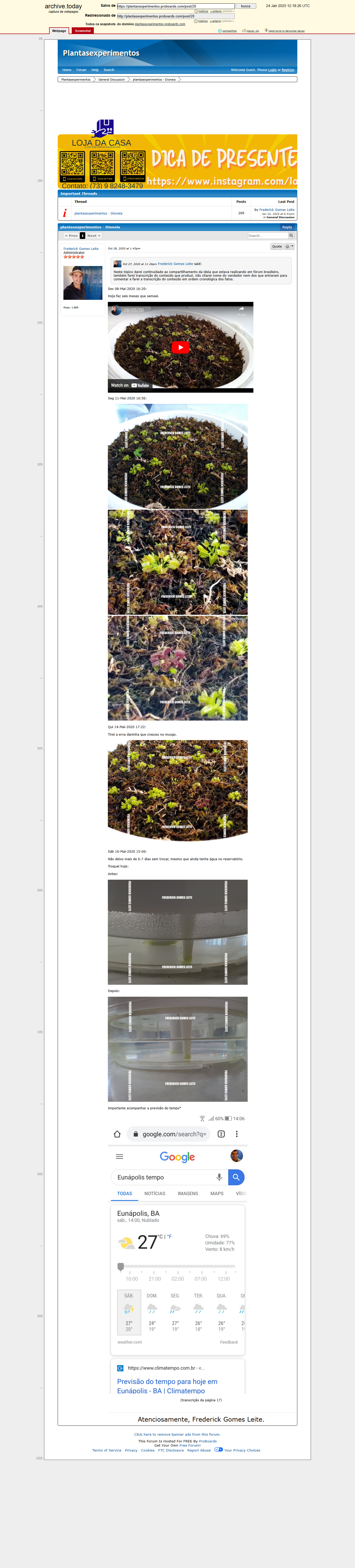 Eu, Frederick Gomes Leite, natural de Eunápolis/Bahia, filho de José do Egito Ferreira Leite com Janilde Gomes Cardoso, com avós paternos Edvaldo Ferreira Leite e Edith Ferreira Leite e avós maternos Jair Gomes Cardoso e Laudelina Carmonia Cardoso, moro no mesmo endereço desde 2004: Rua M, Casa 15, Urbis 2, CEP: 45829086, Eunápolis/BA, e sempre informei meu endereço e dados corretos em todos os cadastros que faço na internet. Em 2019 comprei sementes da planta carnívora Dioneia e usei pela primeira vez a minha técnica - usar plástico específico para estufas que difunde bastante luz como cobertura para vaso, para acelerar a germinação e o crescimento e manter plantas de sol pleno saudáveis sob as condições de poucas horas de luz solar indireta pela manhã - compensando a falta de sol pleno com muita luminosidade natural - no experimento que eu idealizei e executei dentro da minha técnica. Compartilhei em fórum brasileiro que fazia parte como membro comum desde o início, também em minhas redes sociais e vários lugares na internet, encaminhando para o meu tópico em fórum brasileiro. Em 2020 criei o meu fórum grátis, https://plantasexperimentos.proboards.com/thread/3/plantasexperimentos-dioneia, e fiz transcrição de todo material que postei em meu tópico no fórum brasileiro, dando continuidade ao compartilhamento da execução das minhas ideias também com outras plantas de sol pleno desde as sementes. Nos tópicos: A morte é um cobrador muito sério (upload de imagens de capturas online com o Imgur), Porque és pó e ao pó tornarás (capturas online com o Archive.ph), Não te deixes vencer pelo mal, triunfa o mal com o bem (capturas online de capturas online com o Postimages), Você consegue ? (capturas online de capturas online com o ImgBB), Para mim a mente é sempre a melhor arma (upload de imagens de capturas online com o Imghippo), Nunca é tarde demais (capturas online de capturas online com o Freeimage.host), Mas agora isso vai mudar (upload de imagens de capturas online com o YourImageShare), O Titanic vai afundar (upload de imagens de capturas online com o imglink.io), Entendo completamente a gravidade da minha situação (upload de imagens de capturas online com o 8upload) e O reino de Deus está dentro de você (upload de imagens de capturas online com o imgbox), são 10 tópicos de backup carregando todas as postagens do meu fórum em servidores diferentes, com exceção das postagens dos próprios tópicos de backup recentes, que não se repetem em tópicos de backup e confirmam os 11 tópicos de backup que criei em 2024. Tenho duas contas no Imgur (https://imgur.com/user/FrederickGomesLeite/about, https://imgur.com/user/estouaquiagorasim1993/about), que uso para fazer upload dos meus registros fotográficos e capturas de tela com o GoFullPage (https://gofullpage.com/) de todas as minhas postagens no meu fórum e na internet, e conteúdo de capturas online com archive.is/ (.fo .il .md .ph .vn), entre outras formas de backup. No tópico de backup Mesmo inimigos podem se respeitar (https://plantasexperimentos.proboards.com/thread/75/mesmo-inimigos-podem-se-respeitar) estou compartilhando todas as capturas online que faço com o archive.is/ (.fo .il .md .ph .vn) carregando direto de servidores do archive.is/ (.fo .il .md .ph .vn) no meu fórum. Criei o tópico de backup recente, Conte a eles nossa história (https://plantasexperimentos.proboards.com/thread/76/conte-eles-nossa-hist-ria) para salvar o conteúdo (imagens, vídeos e textos) das postagens do meu tópico plantasexperimentos - Dioneia (https://plantasexperimentos.proboards.com/thread/3/plantasexperimentos-dioneia) em vários servidores na internet e carregar novamente no meu fórum. Também estou fazendo backup do source code (código fonte) do meu fórum e capturas online com o archive.is/ (.fo .il .md .ph .vn), em formato de texto que também pode ser compilado online (carregado), exibindo a postagem com a captura online da postagem e o conteúdo (imagens, textos e vídeos) no navegador em formato visual, confirmando a veracidade dos meus relatos, a existência das minhas postagens e capturas online com o archive.is/ (.fo .il .md .ph .vn), entre outras formas de backup, pois um homem prevenido vale por dois.