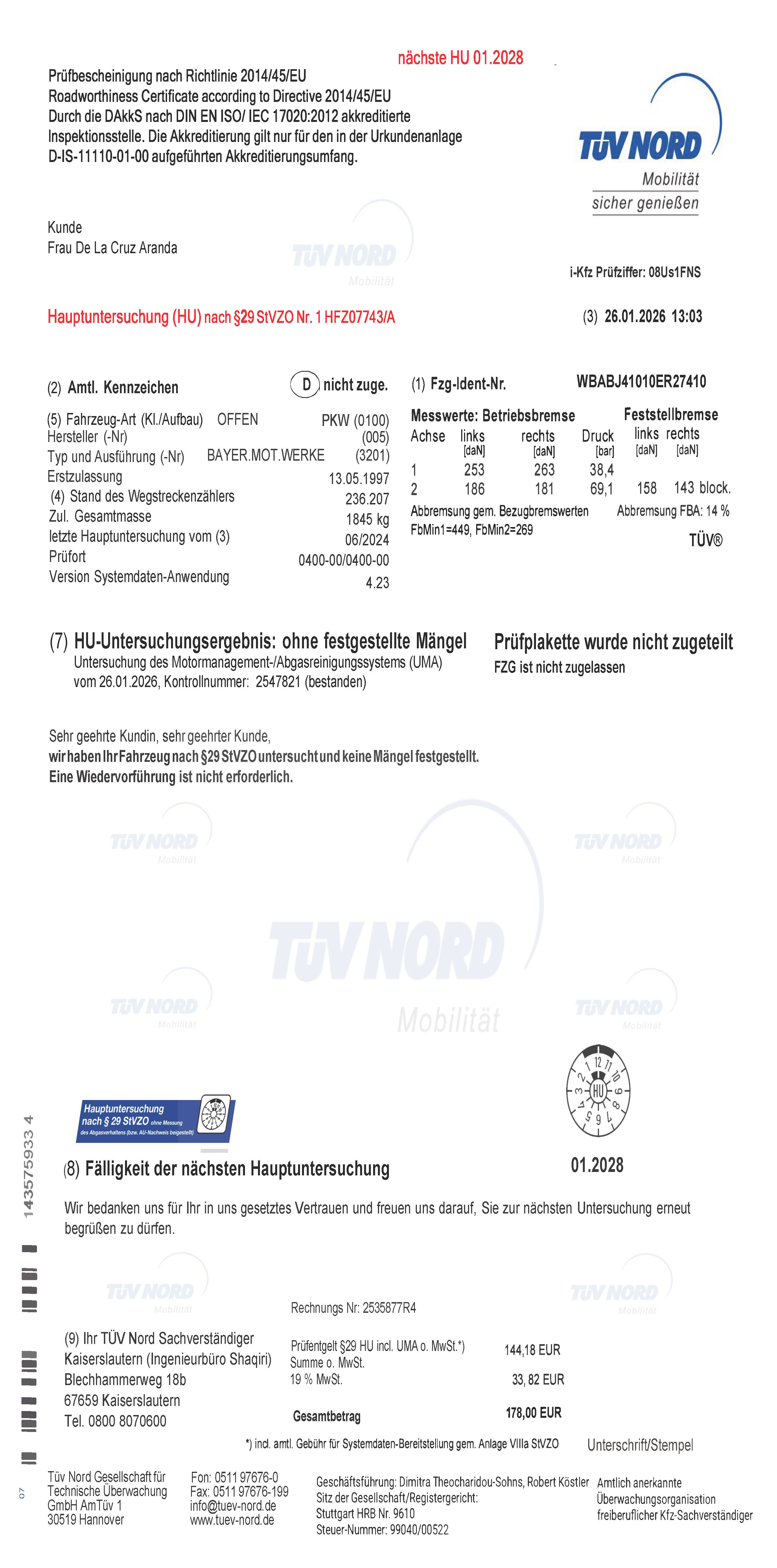 HU bestanden, nächste HU Jan. 2028
