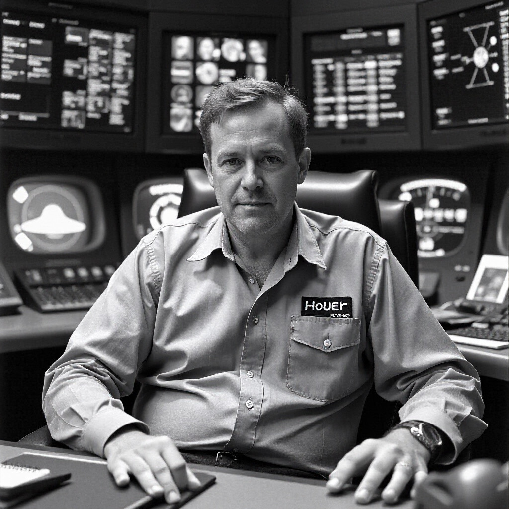 hyperalistic robert habeck sits in a ufo command center and pus a button down with the word roger on