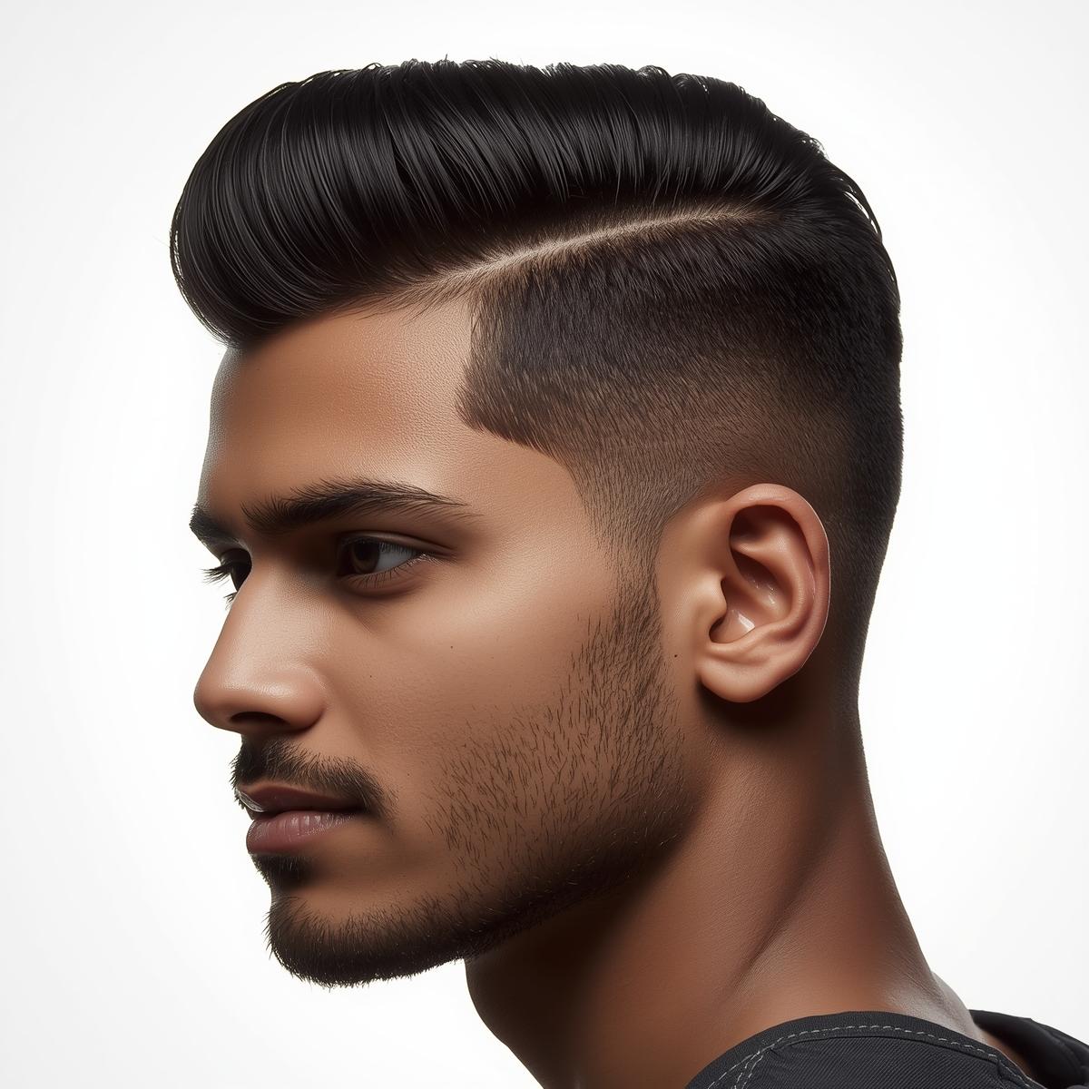 Hyperrealistic portrait of a North Indian male with a Comb Over (clean side part), crisp studio ligh