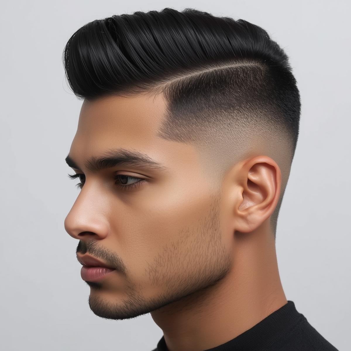 Hyperrealistic portrait of a North Indian male with a High Fade, sharp transition high on the sides,