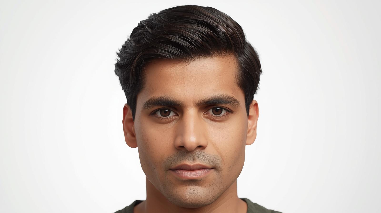 Hyperrealistic portrait of a North Indian male with Side Swept Hair, front facing, clean white backg