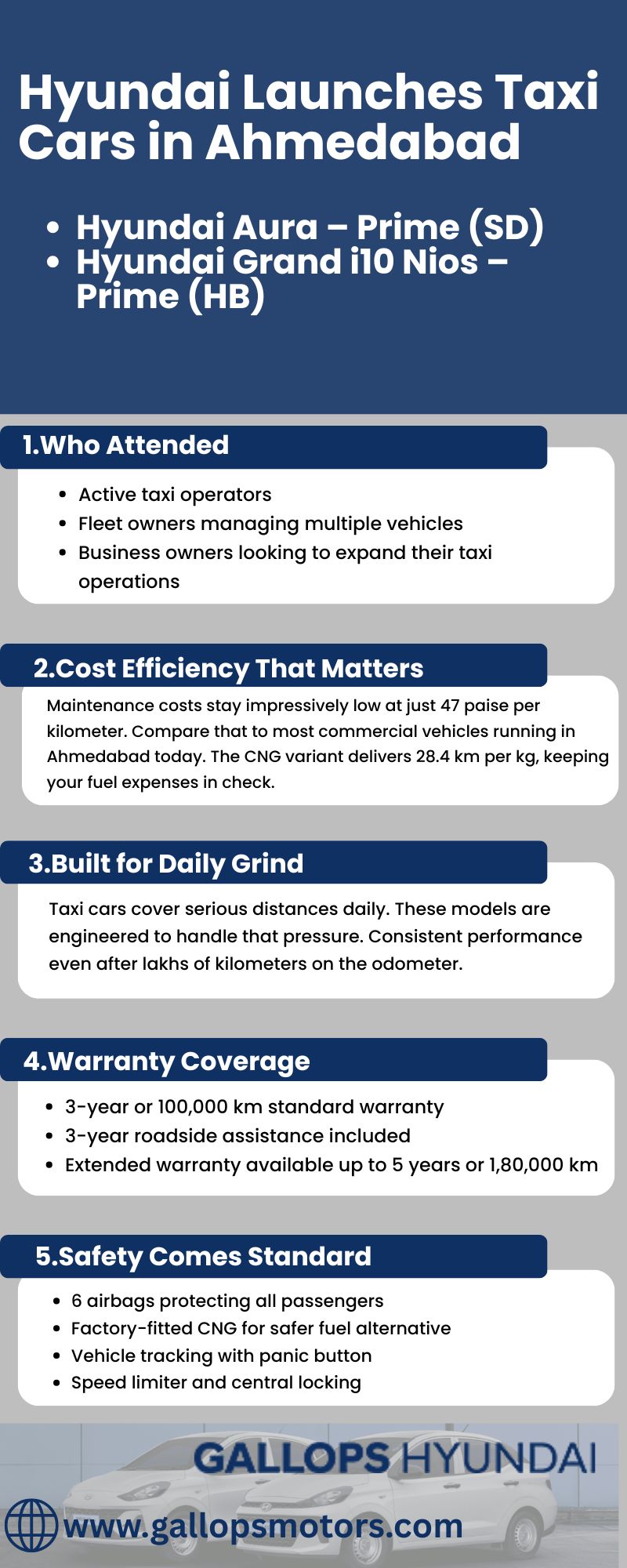 Hyundai's taxi-specific models address real fleet owner concerns. Lower running costs, better mileage, and reliable performance for daily operations. Gallops Hyundai, an authorized Hyundai dealer in Ahmedabad, brings these purpose-built vehicles with strong service support. Ready to see how these cars fit your taxi business? Visit Gallops Hyundai Vastral for a test drive today.
