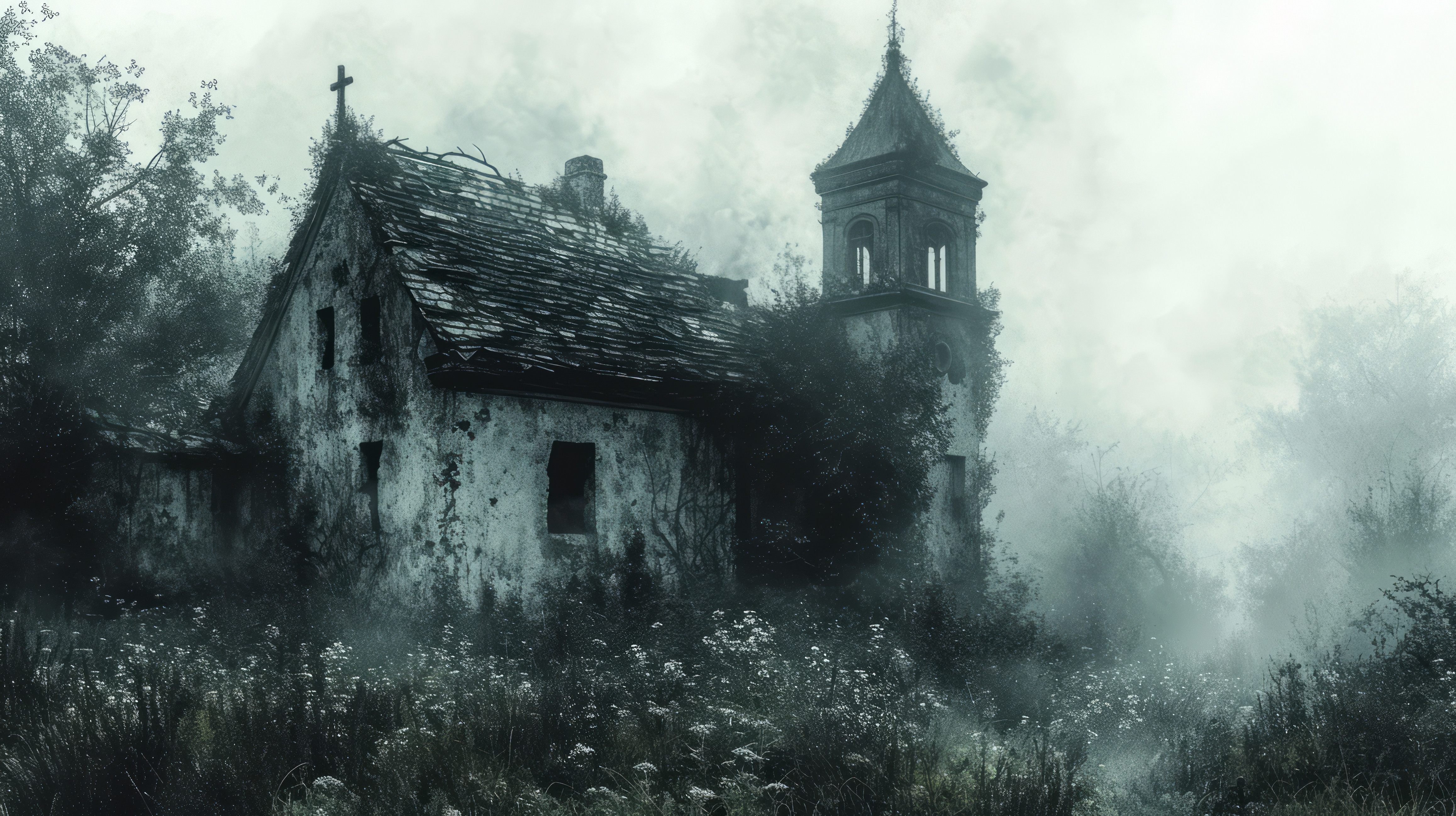 illustration on white background of a An old building in an overgrown bush forest with a burnt roof