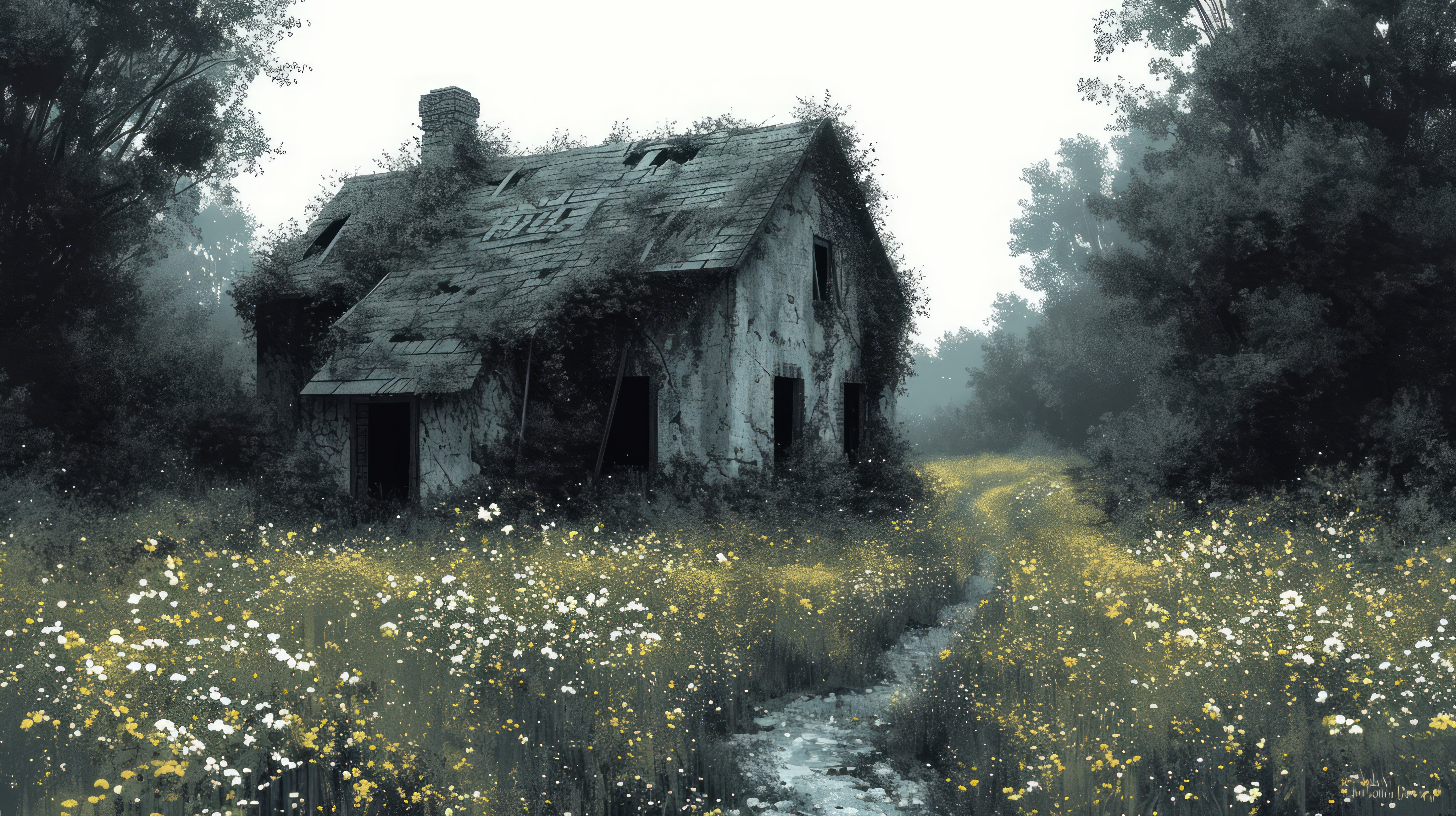 illustration on white background of a An old building in an overgrown bush forest with a burnt roof