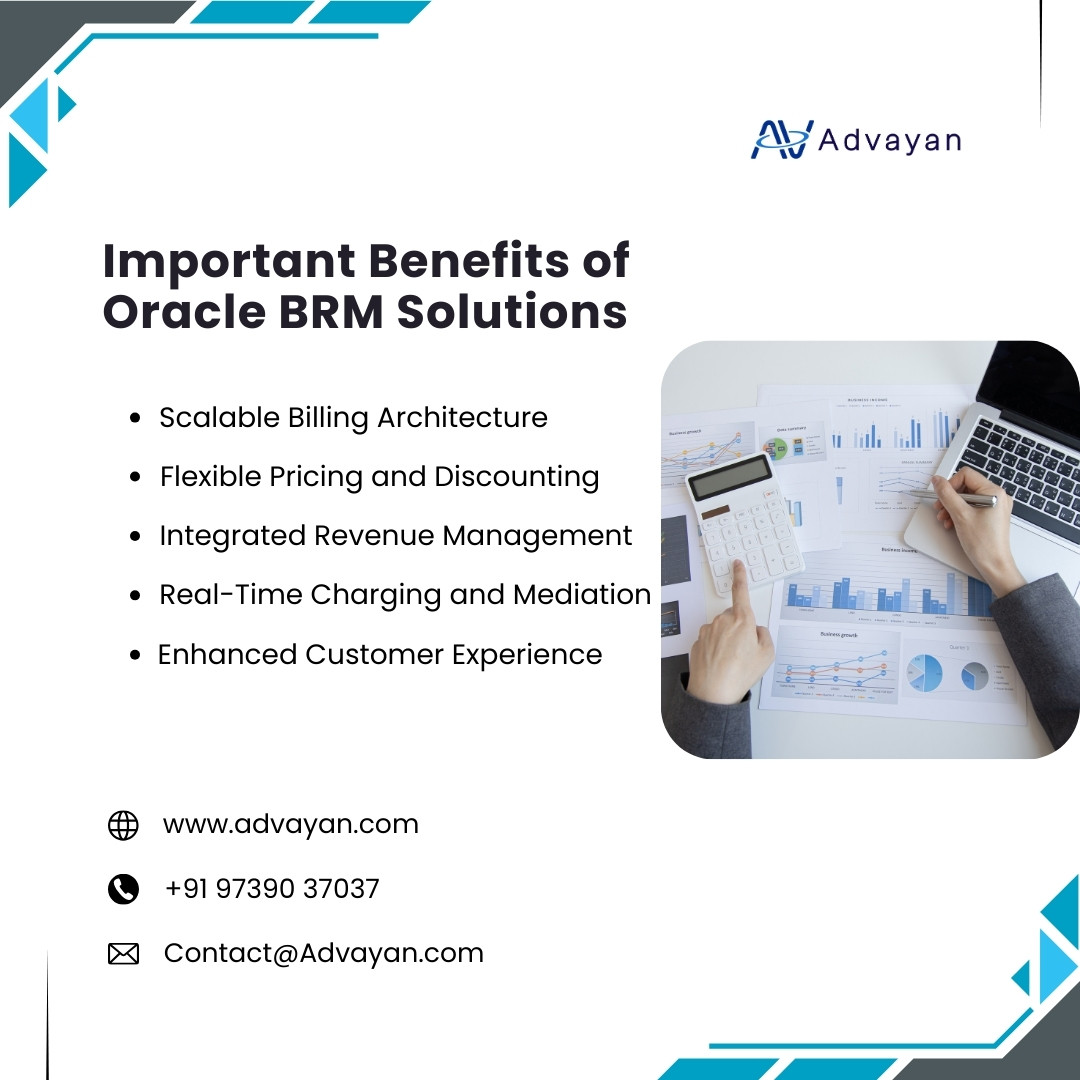 Oracle BRM Solutions from Advayan enable enterprises to manage complex billing and revenue operations with accuracy, speed, and scalability. Advayan delivers end to end Oracle BRM implementations designed to support real time charging, flexible pricing models, and seamless revenue recognition across high volume environments. Each solution is tailored to business goals, ensuring billing systems adapt as services, subscriptions, and customer expectations evolve.