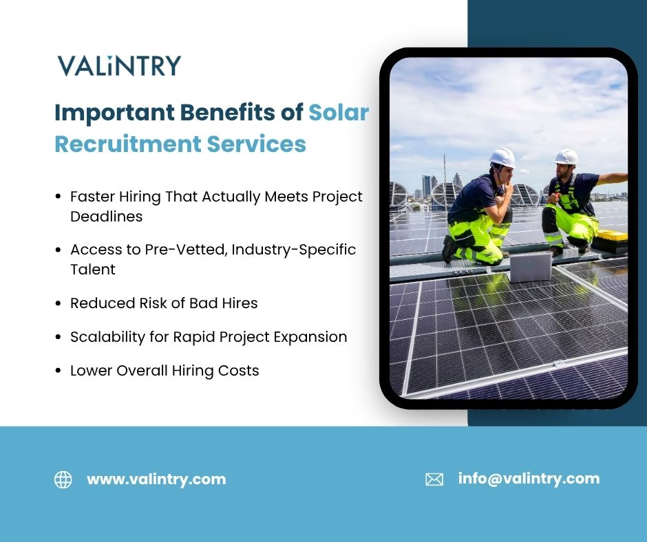 Solar Recruitment Services play a critical role in helping energy companies secure skilled professionals in a highly competitive and rapidly evolving market. VALiNTRY delivers specialized hiring solutions designed specifically for the solar industry, focusing on speed, accuracy, and long-term success. By leveraging advanced sourcing strategies and a strong network of pre-qualified candidates, VALiNTRY connects businesses with experienced solar engineers, project managers, and technical specialists who understand the complexities of renewable energy projects.