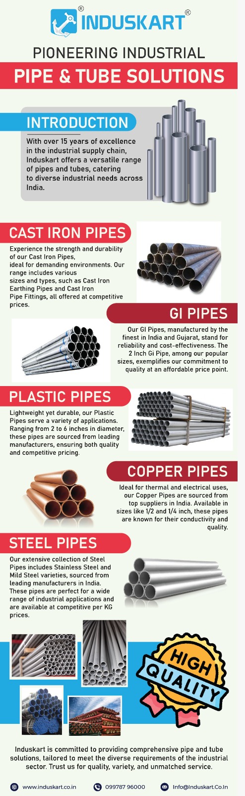 Induskart, a renowned name in the industrial supply sector for over 15 years, offers a comprehensive range of pipes and tubes, ensuring high quality and affordability across various industrial applications. This company specialises in providing Steel Pipes, Plastic Pipes, Stainless Steel Pipes, Copper Pipes, and Cast Iron Pipes, along with a wide array of fittings, catering to the diverse needs of the industrial community.