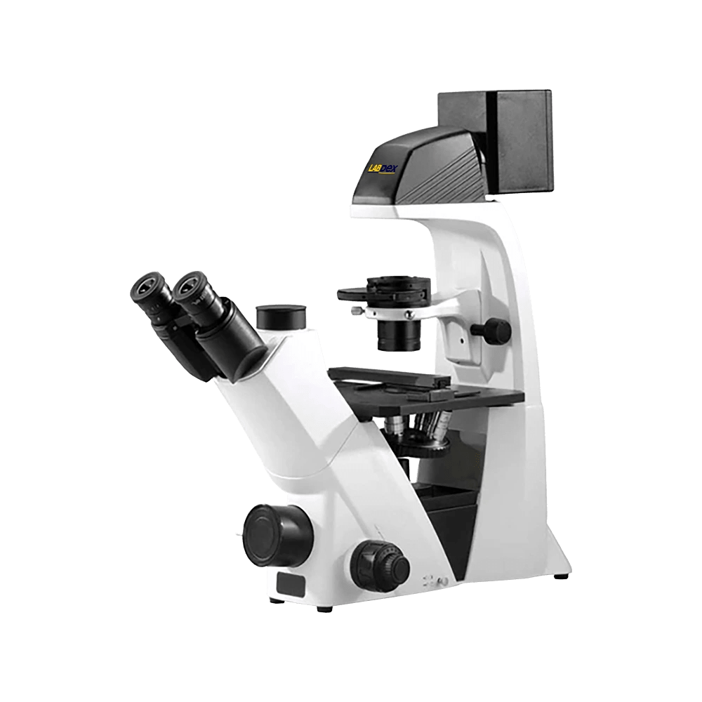 Labdex Infinite Inverted Microscope features a trinocular head, a 5-position bidirectional nosepiece, a WF10x/22mm eyepiece, infinity plan phase contrast objectives, and smooth coaxial focusing. Includes halogen illumination, advanced software, and a clear-field digital camera with an iPad holder for sharp imaging and analysis.