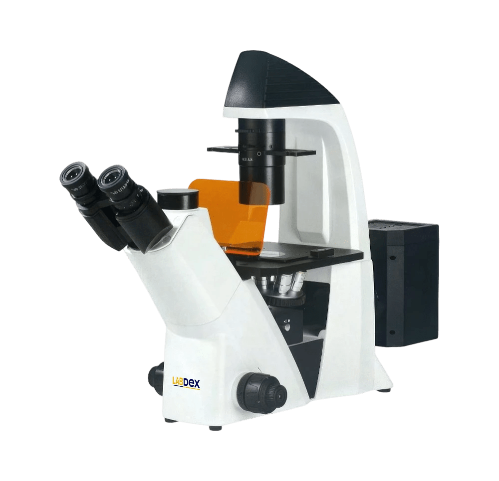 Labdex Inverted Fluorescence Microscope features an epi-fluorescence system with a trinocular head and a 5-position ball bearing nosepiece. Includes a WF10X/22mm eyepiece, coaxial coarse/fine focus, 0.3 NA long working distance condenser, 20MP camera, 5W LED Koehler illumination, red/green filters, and measuring software.