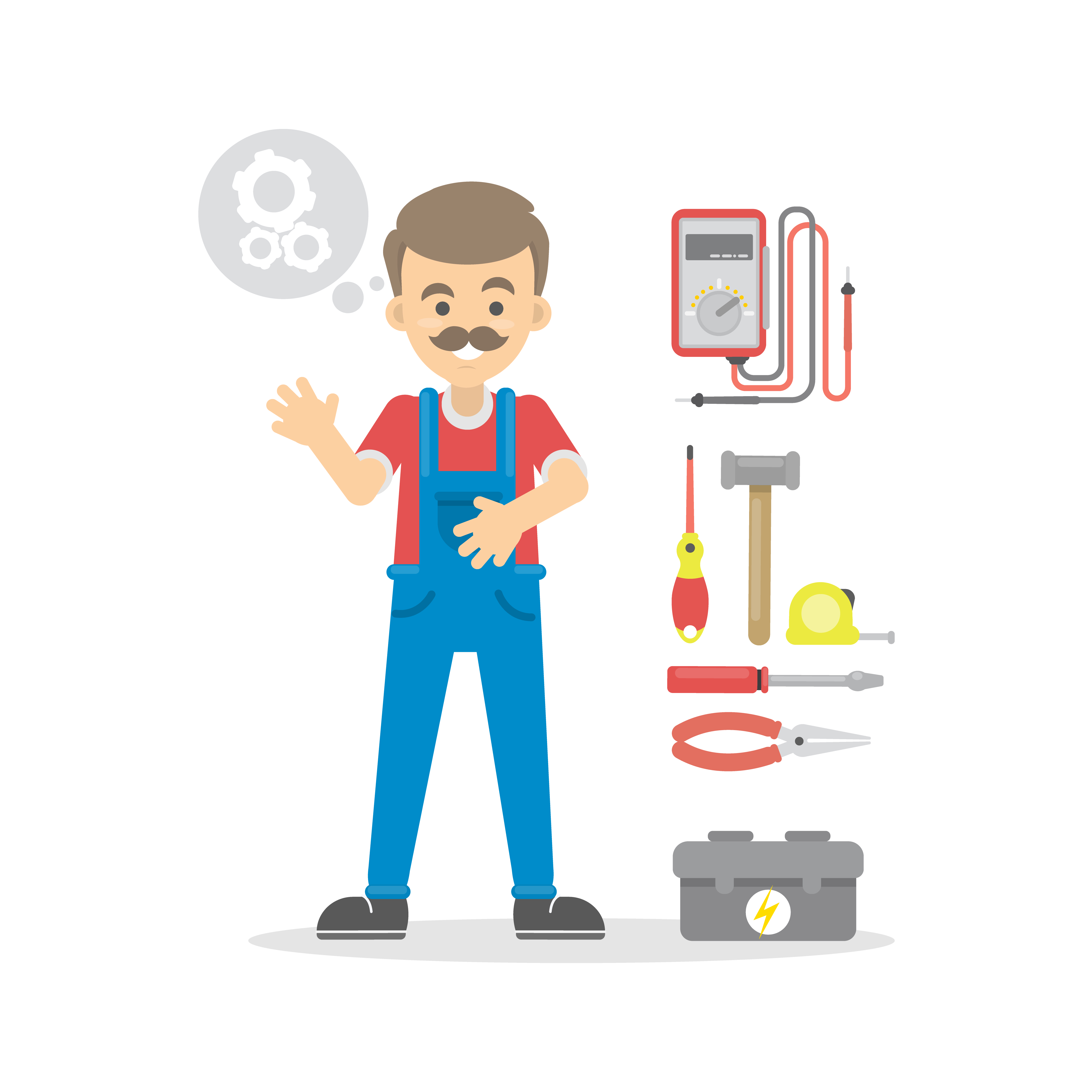 Isolated cartoon electrician on white background with tools.