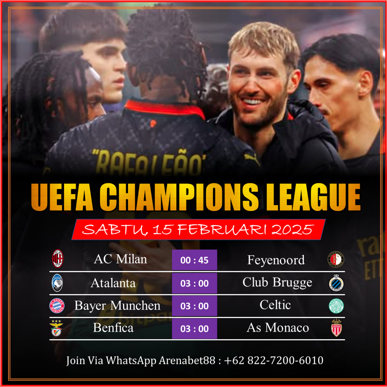 Jadwal Liga Champions Dini Hari Nanti (19-Februari 2025) 📌 Rabu, 19 Februari 2025 AC Milan vs Feyenoord – 00:45 WIB Atalanta vs Club Brugge – 03:00 WIB Bayern Munich vs Celtic – 03:00 WIB Benfica vs AS Monaco – 03:00 WIB Tonton & pasang taruhannya di ARENABET88! Menangkan taruhanmu, raih hadiah besar, dan buktikan kehebatanmu! 🔥💰 #UCL #ChampionsLeague #BigMatch #SepakBola #Matchday #FootballVibes #WatchLive #ACMilan #Feyenoord #RealMadrid #ManCity #MilanVsFeyenoord #RealMadridVsManCity #FootballClubs #UCLClash #ChampionsLeagueClubs #FootballPower #ACMilanFans #FeyenoordFans #RMFC #ManCityFans #UCL2025