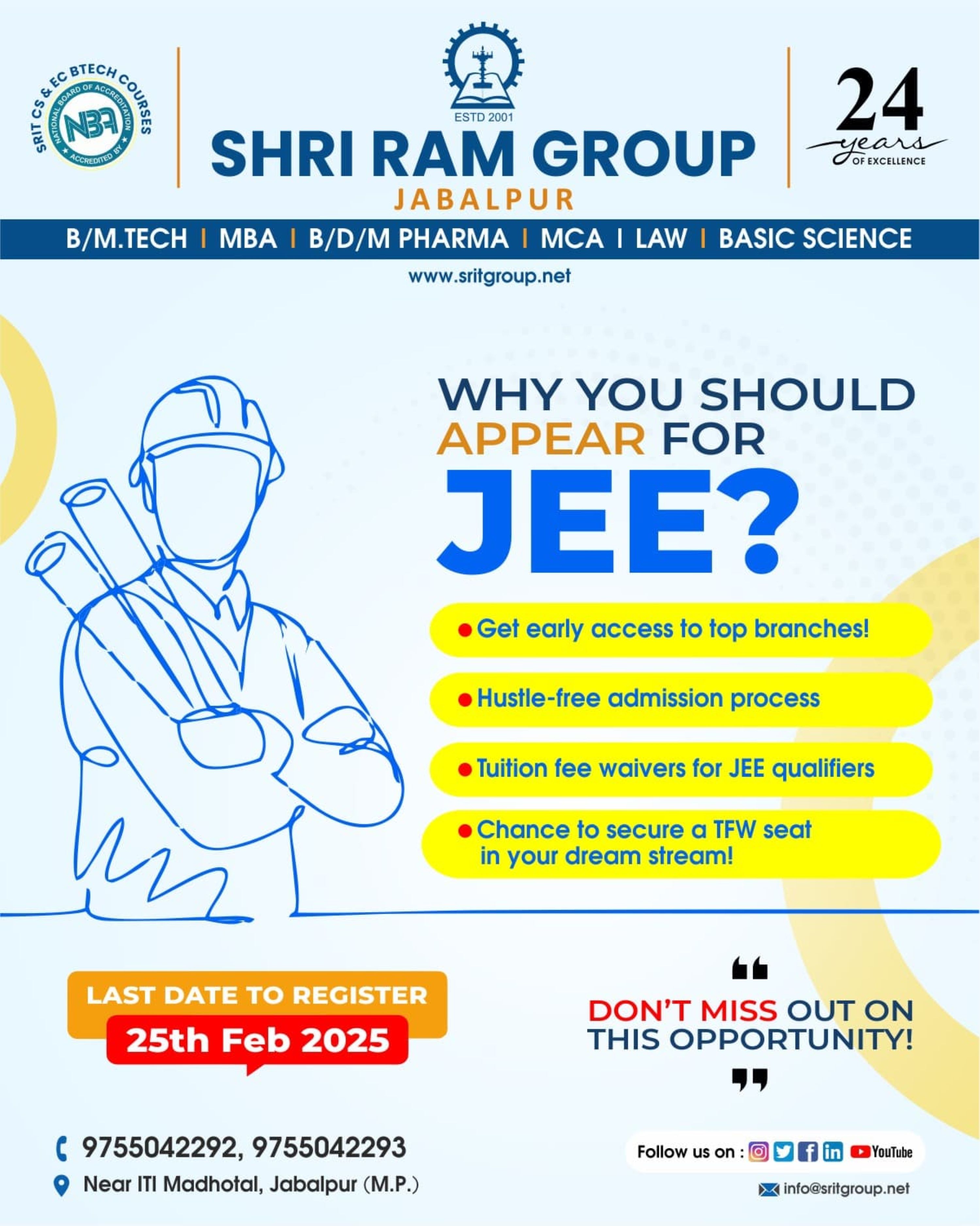 The JEE Entrance Examination is the key to securing admission to a top engineering college in MP. It tests students’ knowledge in physics, chemistry, and mathematics, challenging their problem-solving skills. A high score opens doors to prestigious institutions, shaping bright futures for aspiring engineers with quality education and career opportunities.