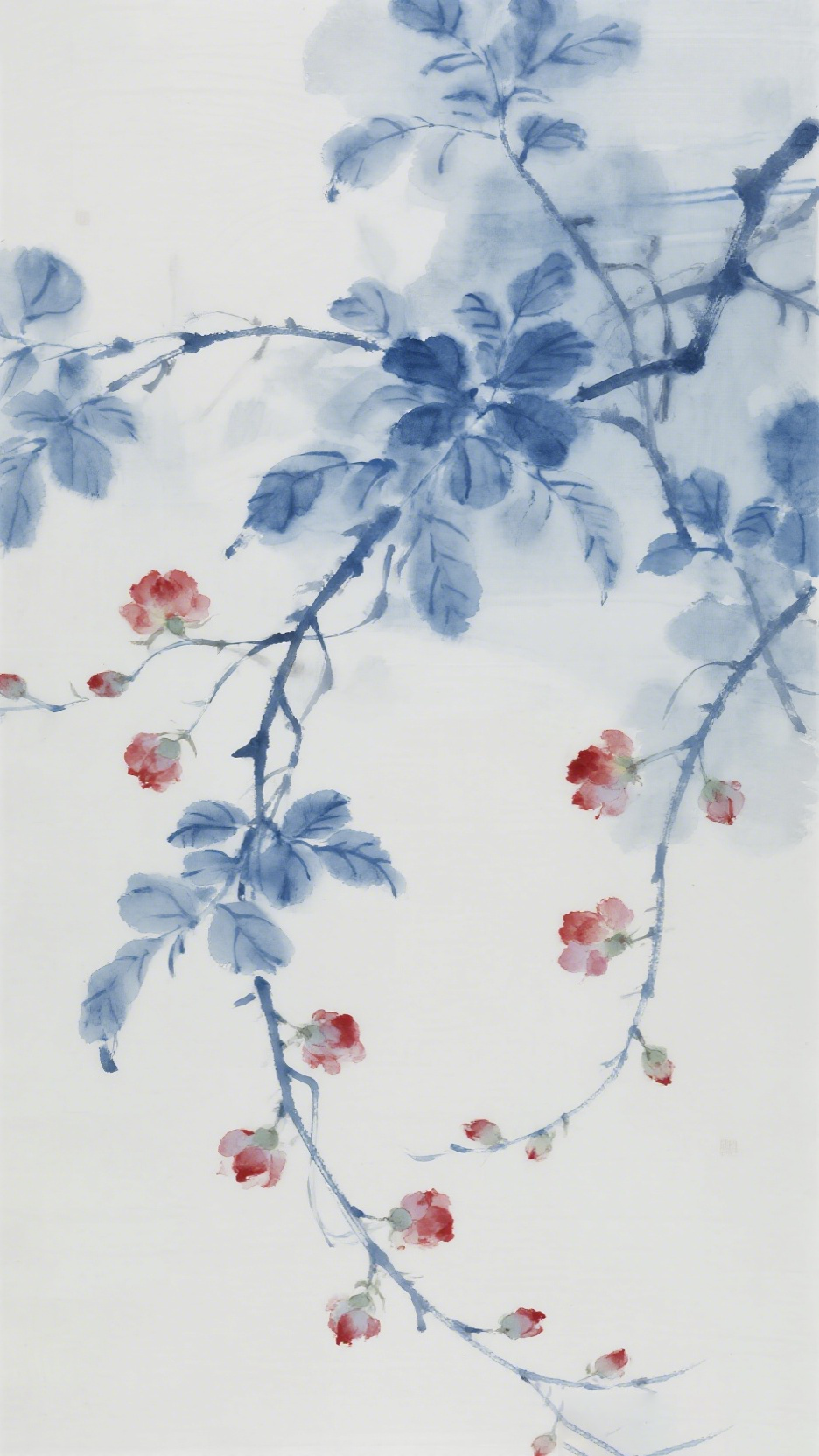 jimeng 2026 01 30 4485 瓷板画,青花釉中彩工笔画,线条为深浅蓝色,枝条蜿蜒,精致各色阶红色小蔷薇花,艺术...
