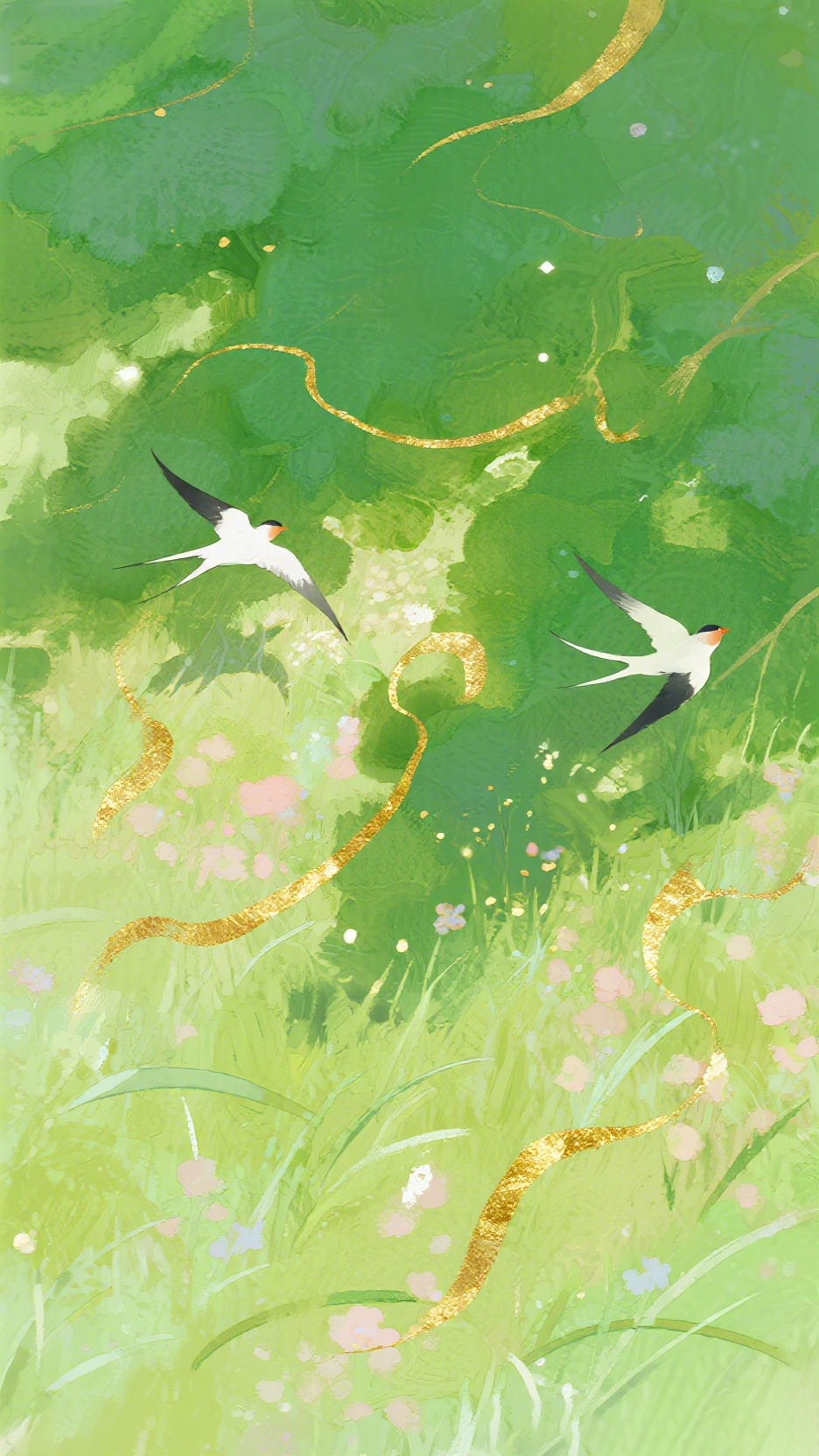 jimeng 2026 02 05 8556 春日里的阳光、草地、微风、飞鸟、金箔岩彩,插画,治愈,春天的配色,绿色,水墨淡彩...