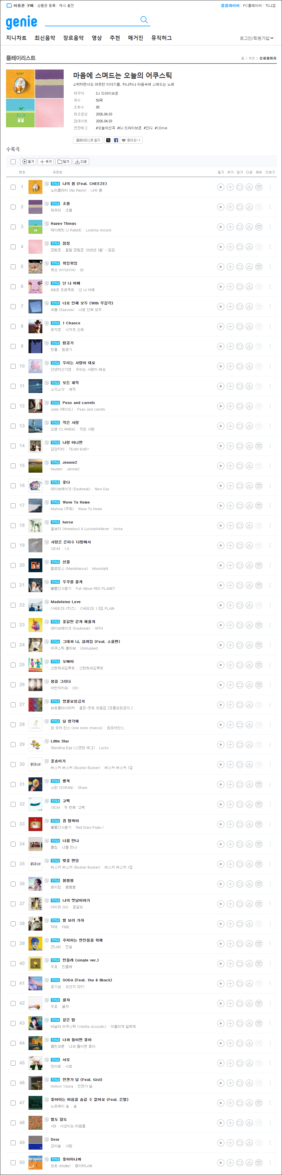 지니(Genie) 마음에 스며드는 오늘의 어쿠스틱 (26.04.03 업뎃)