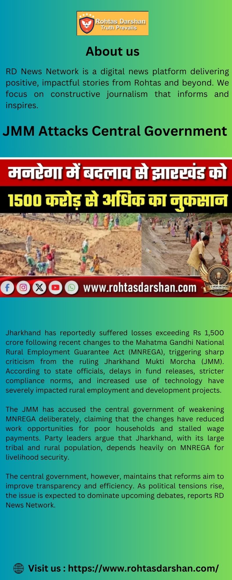 Jharkhand has reportedly suffered losses exceeding Rs 1,500 crore following recent changes in the MNREGA scheme, triggering sharp criticism from the Jharkhand Mukti Morcha (JMM). The party has accused the central government of weakening a vital rural employment lifeline that supports millions of workers across the state. According to JMM leaders, delayed payments, reduced workdays, and stricter implementation norms have severely impacted livelihoods and stalled development projects. The state government has demanded immediate corrective measures. RD News Network will continue to track political reactions and policy developments closely.