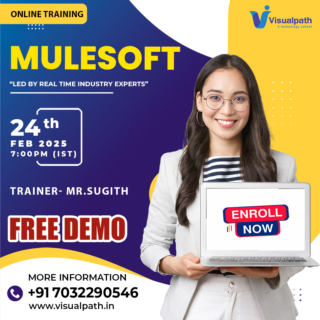 Visualpath offers MuleSoft training Learn from real-time expert instructors and work on hands-on projects. Our training includes 24/7 access to recorded sessions, live projects & real-time examples, and job-oriented training. our comprehensive program is available globally including the USA, UK, Canada, and more. Gain practical skills and industry insights to thrive in cloud computing. Enroll now and elevate your future