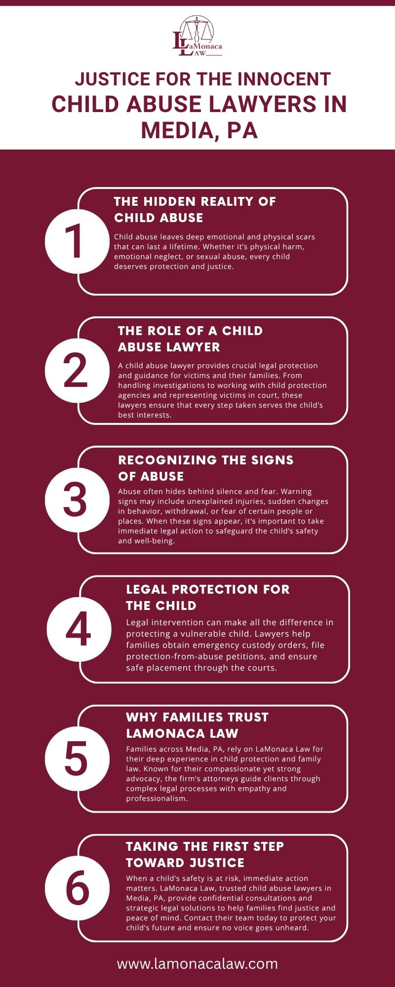 This infographic highlights the vital role of child abuse lawyers in Media, PA, in protecting vulnerable children and seeking justice. It explains how LaMonaca Law supports families through every step — from identifying signs of abuse to obtaining legal protection and court advocacy. The content emphasizes the importance of taking swift action, ensuring safety, and holding abusers accountable. With compassion, experience, and dedication, We stands as a trusted ally for families in crisis, helping them restore safety, dignity, and hope for a brighter, abuse-free future.