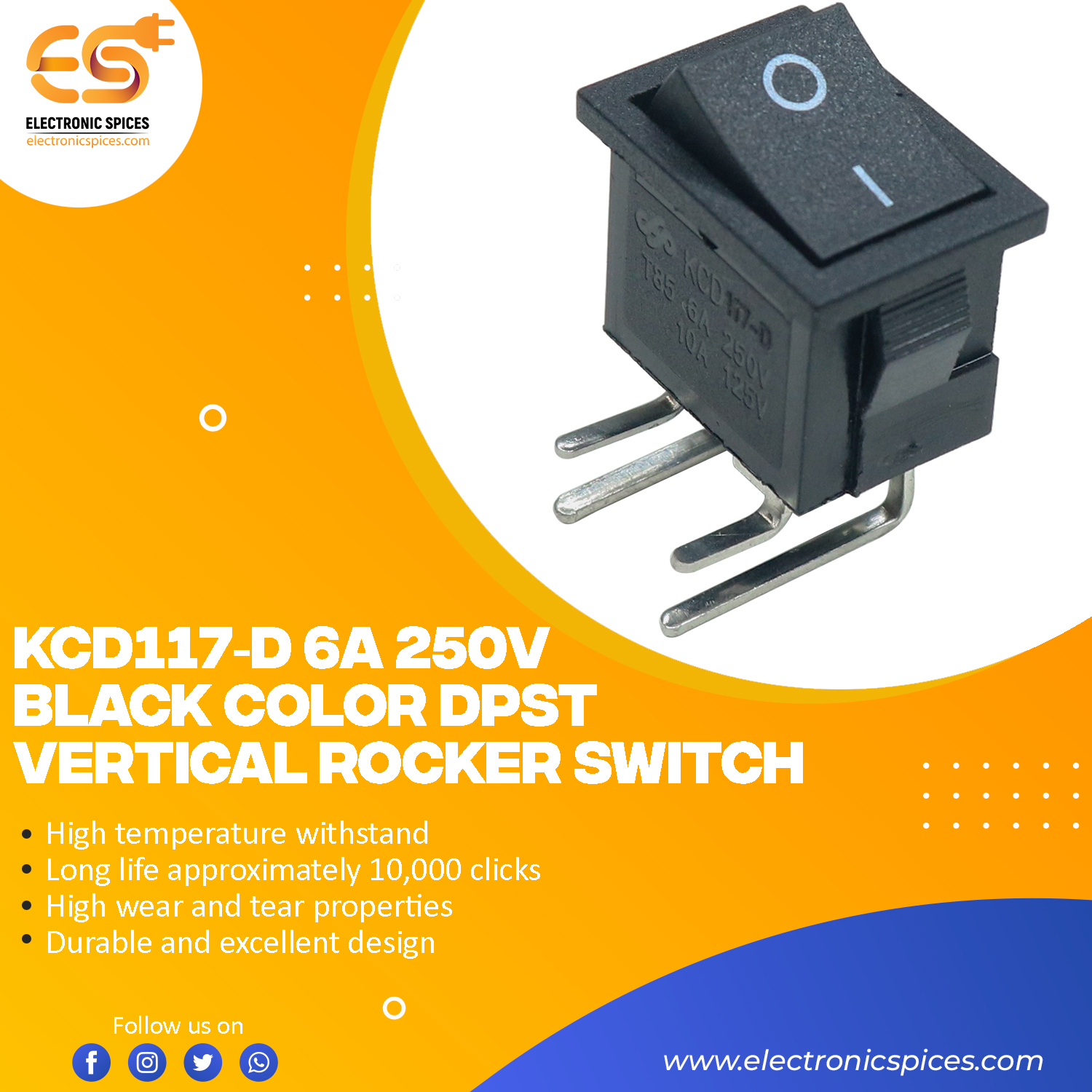 KCD117 D 6A 250V black color DPST Vertical rocker switch