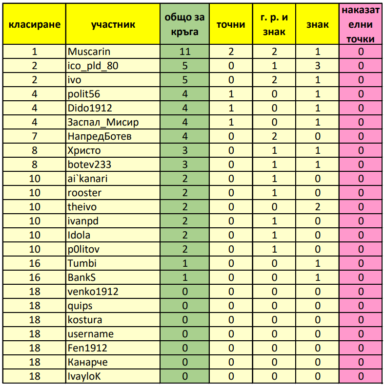 Класиране за 19 ти кръг