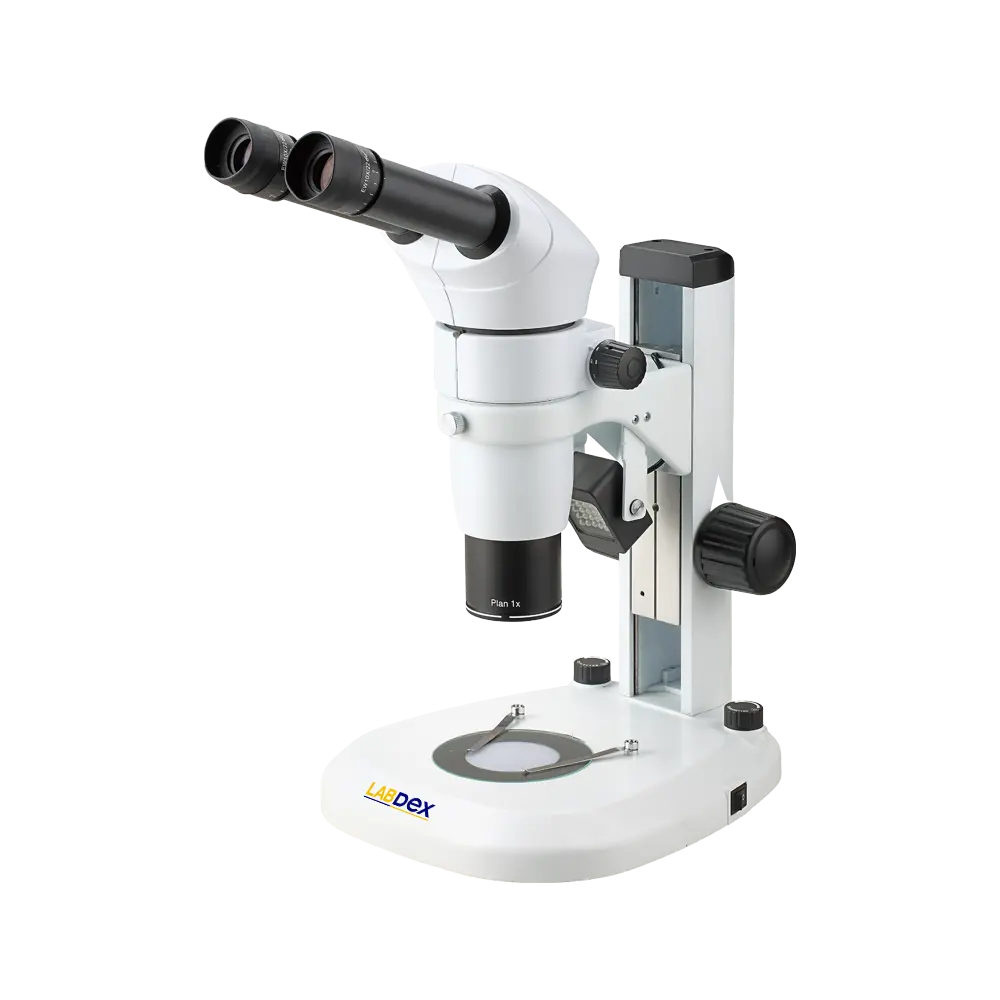 LabDex LX714SMS Stereo Microscope is designed for laboratories needing sharp stereo images and easy handling. It features zoom magnification, WF10X/22 mm eyepieces, a 20° binocular head, and LED transmitted/reflected lighting for daily sample inspection.