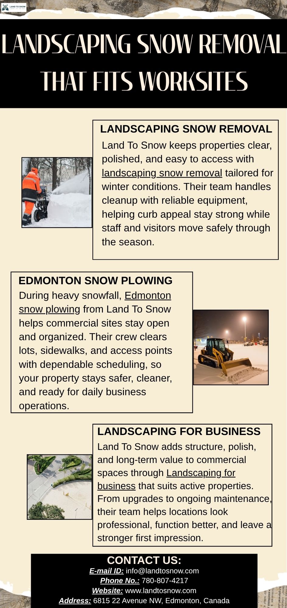 Land To Snow keeps commercial properties clear through winter with landscaping snow removal that protects curb appeal. Their crews combine practical snow clearing with dependable property care, making access easier for customers, tenants, and employees every day.