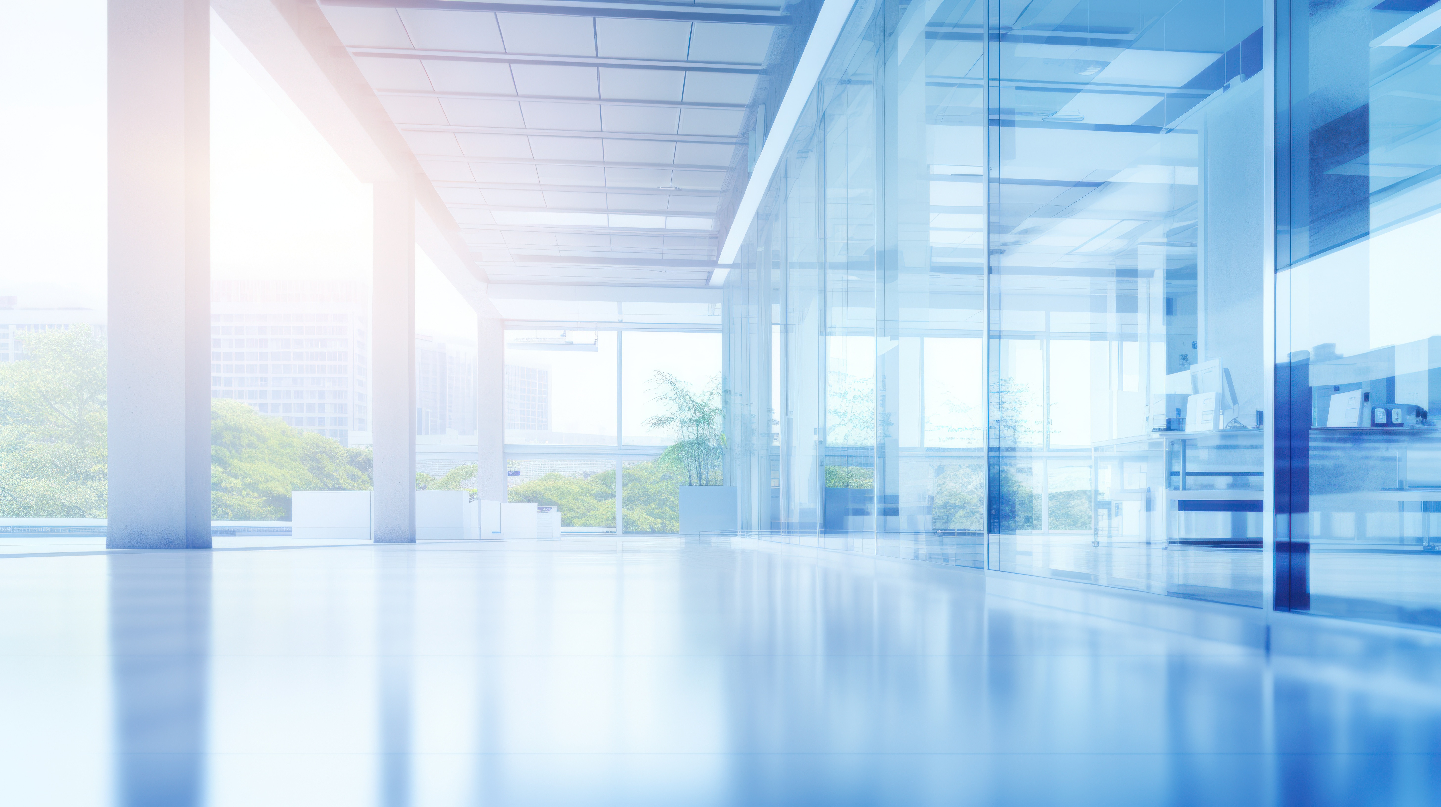 Light blurred background The hall of an office or medical institution with panoramic windows and a p