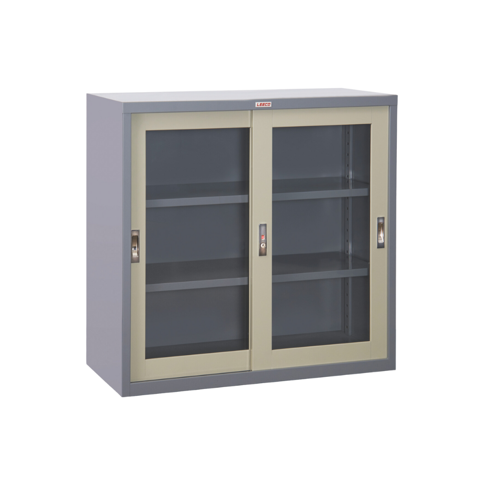 ลีโก้ ตู้บานเลื่อนกระจกทรงเตี้ยอเนกประสงค์ 3 ฟุต 3 ชั้น สีเทาสลับ