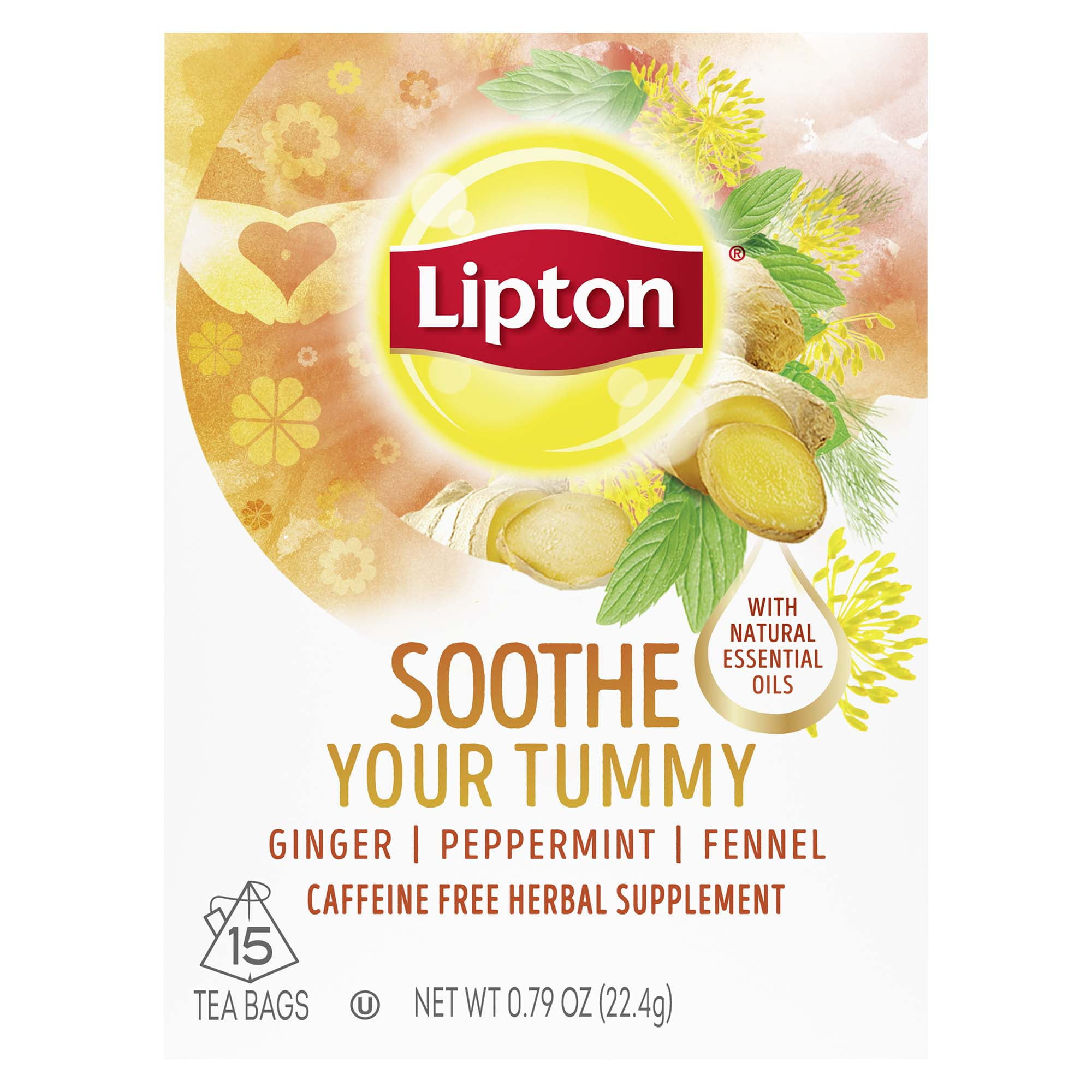 Lipton Soothe Your Tummy Herbal Supplement Ginger Peppermint and Fennel Caffeine Free 15 Count Box a